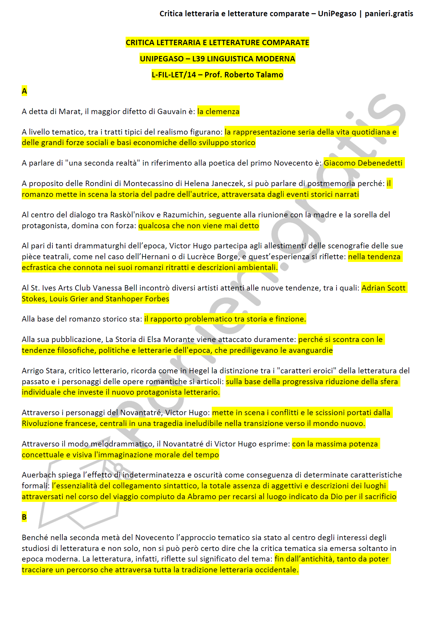 Paniere Critica letteraria e letterature comparate (L-FIL-LET/14), in ordine alfabetico per il CdS LM39 Linguistica moderna, Prof. Roberto Talamo - UniPegasoInformazioni Aggiuntive