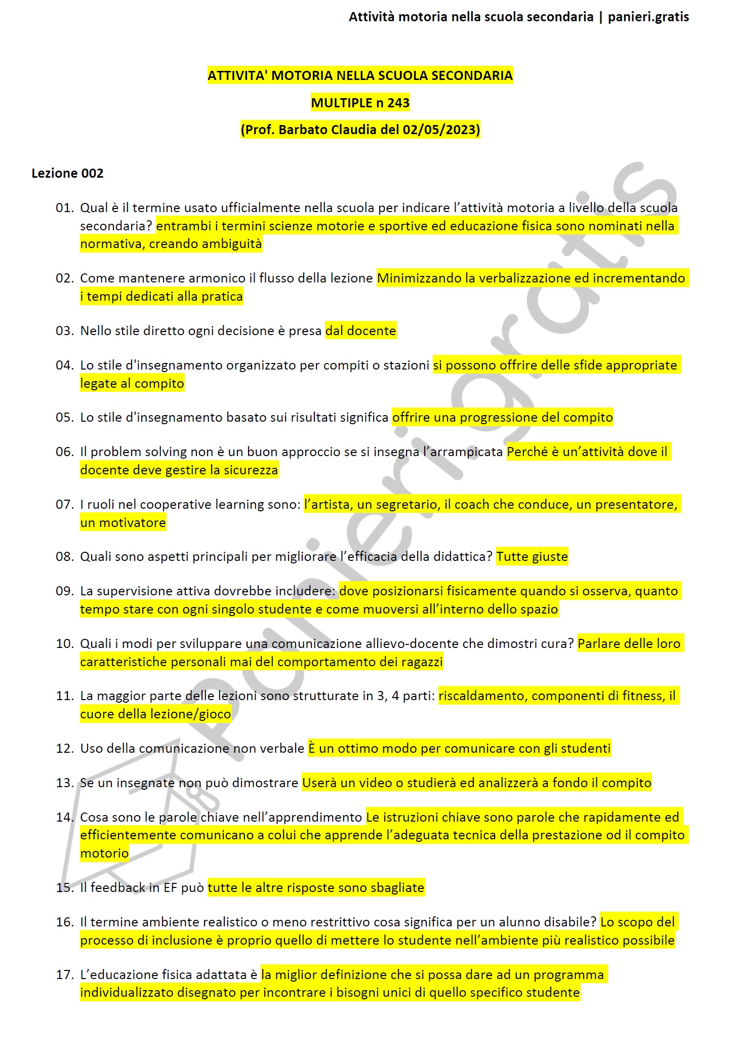 Paniere di Attività motoria nella scuola secondaria - MULTIPLE - in ordine di lezione per il CdS in Scienze dell'esercizio fisico per il benessere e la salute, Prof. Barbato Claudia del 02/05/2023Informazioni Aggiuntive