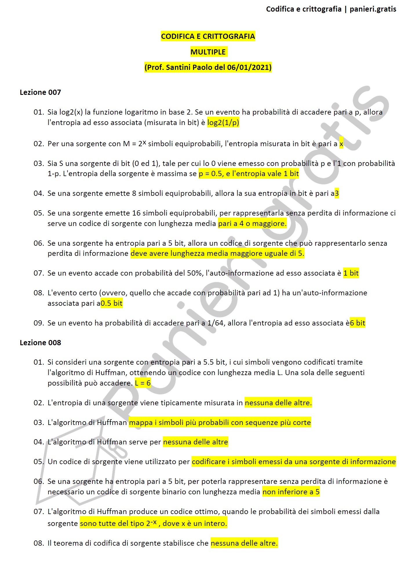 Paniere di Codifica e crittografia - MULTIPLE - in ordine di lezione per il CdS in Ingegneria informatica e dell'automazione, Prof. Santini Paolo del 06/01/2021 - eCampusInformazioni Aggiuntive