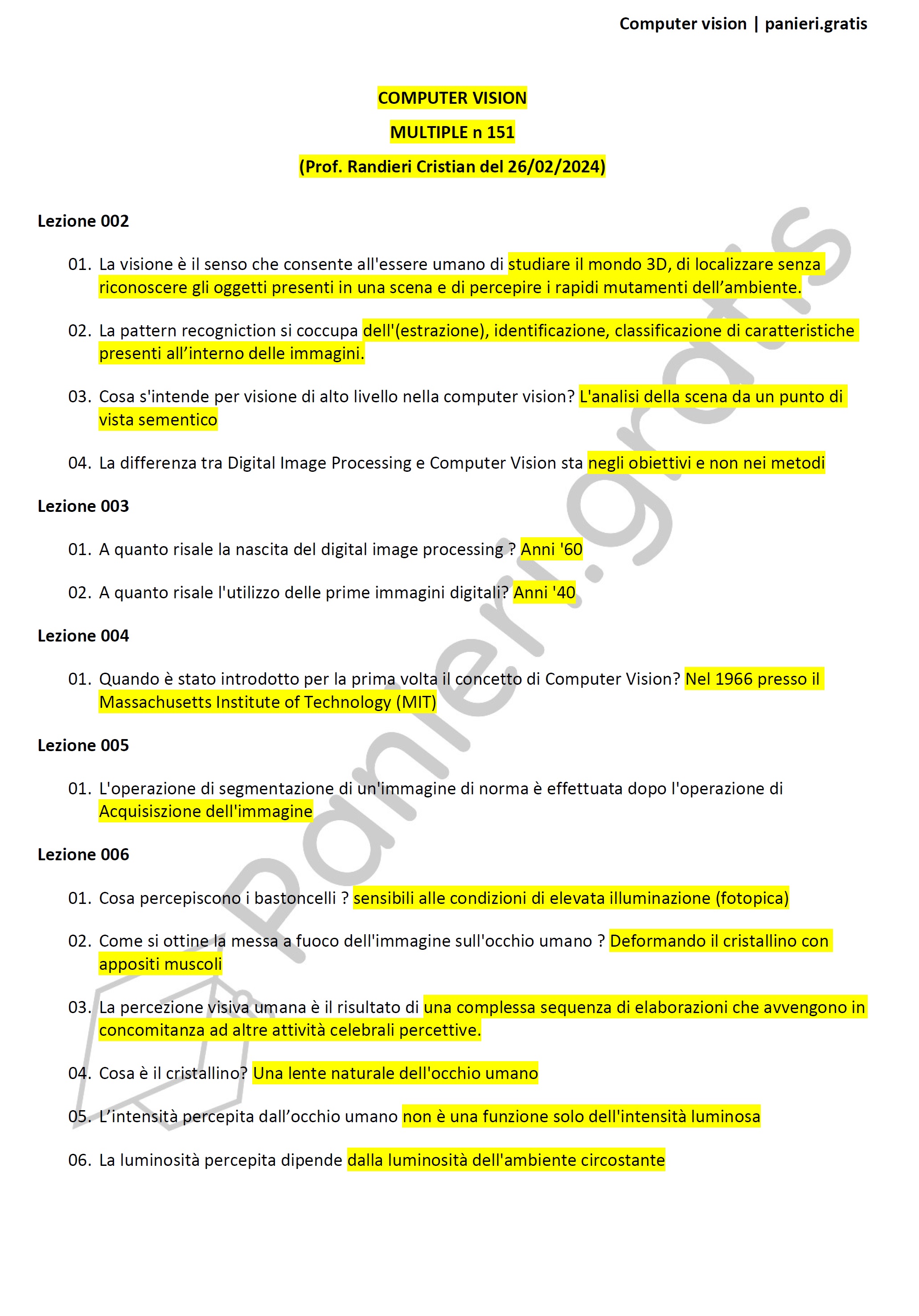 Paniere di Computer vision - MULTIPLE - in ordine di lezioni per il CdS in Ingegneria informatica e dell'automazione eCampus, Prof. Randieri Cristian del 26/02/2024Informazioni Aggiuntive