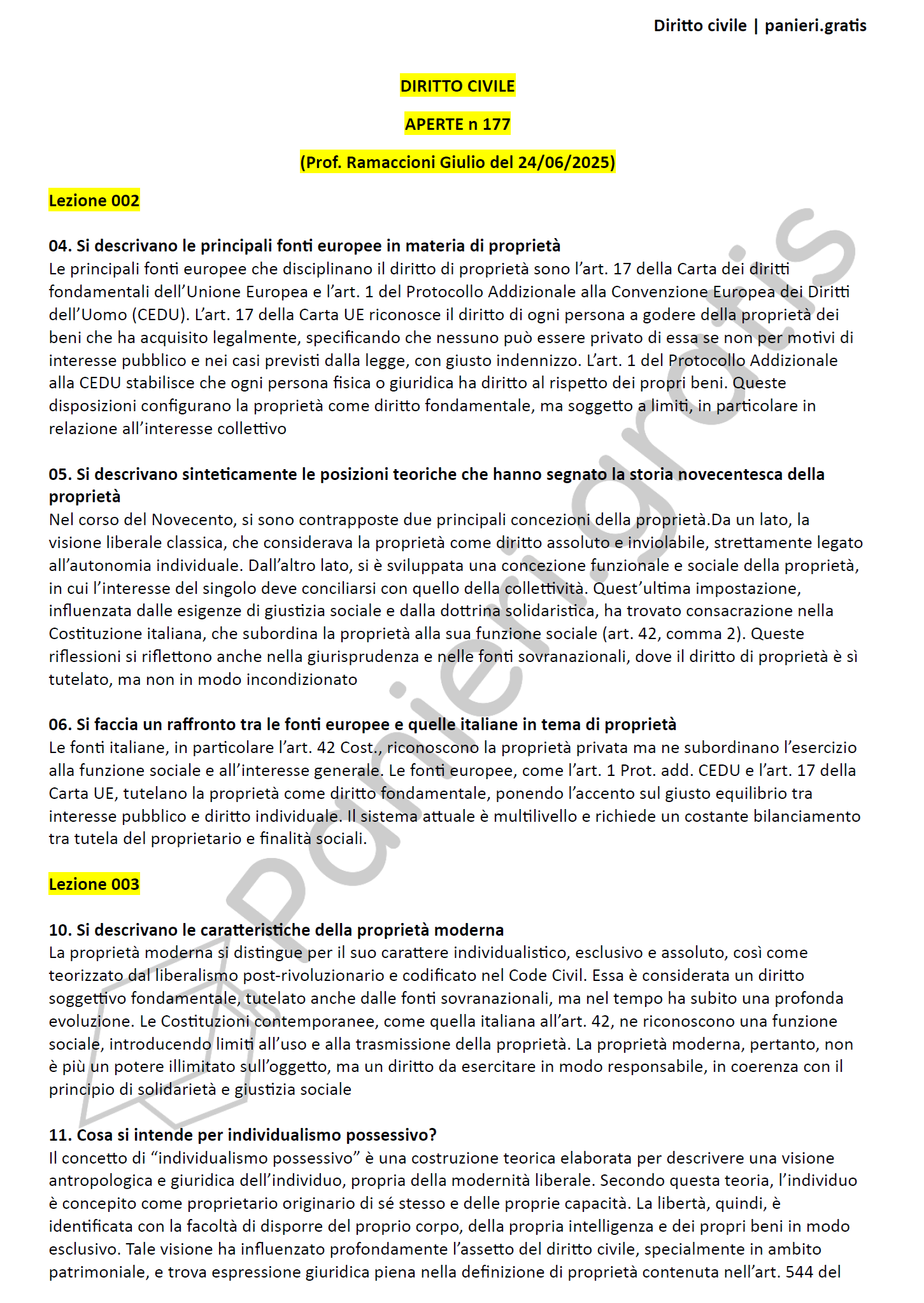 Paniere di Diritto civile - APERTE - in ordine di lezione per il CdS in Giurisprudenza, Prof. Ramaccioni Giulio del 24/06/2025 - eCampusInformazioni Aggiuntive