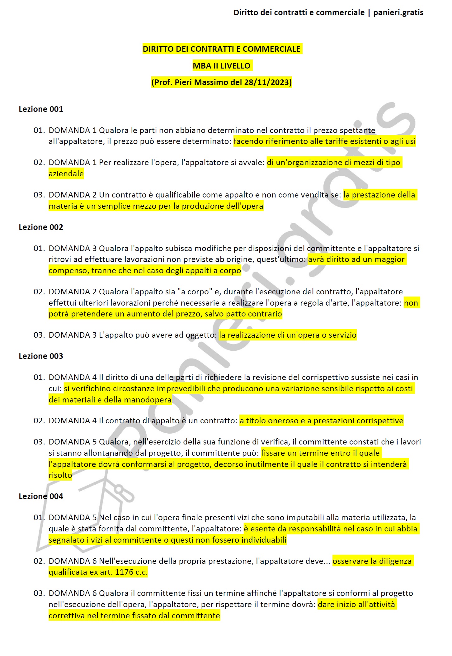 Paniere di Diritto dei contratti e commerciale, in ordine di lezione per il Master MBA II Livello, Prof. Pieri Massimo del 28/11/2023Informazioni Aggiuntive
