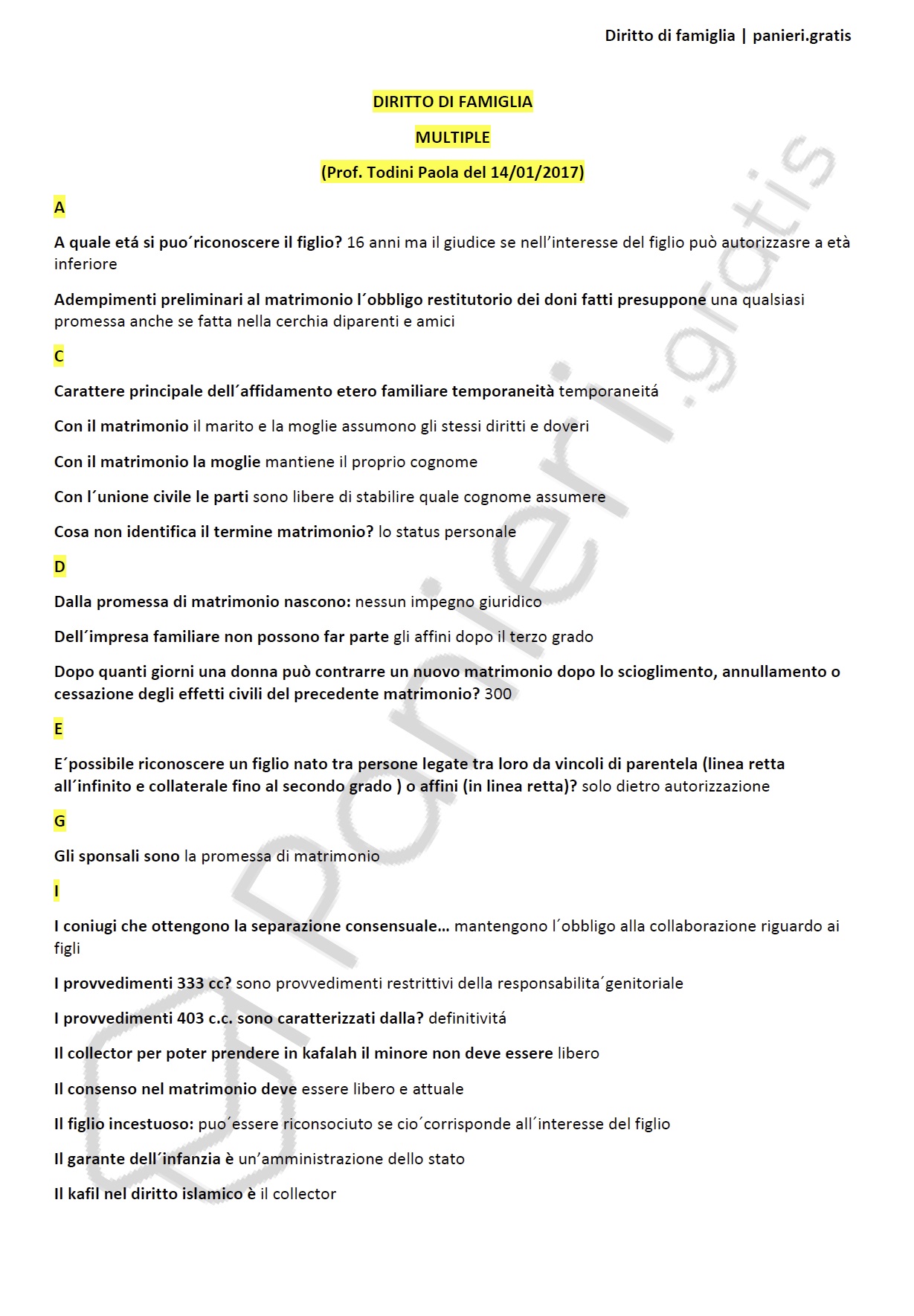 Paniere di diritto di famiglia - Multiple - in ordine alfabetico per la facoltà di Giurisprudenza, Prof. Todini Paola del 14/01/2017Informazioni Aggiuntive