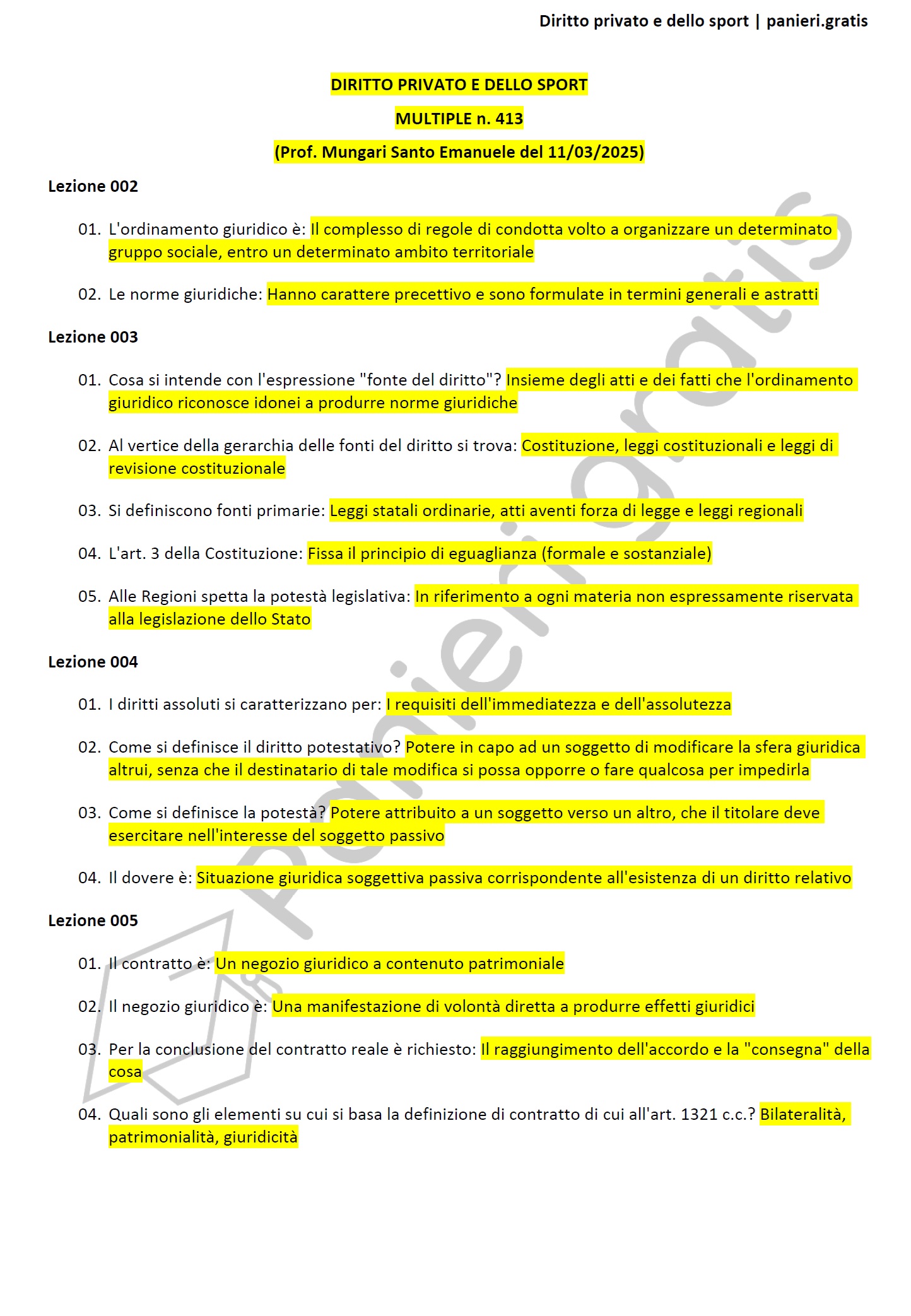 Paniere di Diritto privato e dello sport - MULTIPLE - in ordine di lezione per il CdS in Scienze delle attività motorie e sportiva, Prof. Mungari Santo Emanuele del 11/03/2025 - eCampusInformazioni Aggiuntive