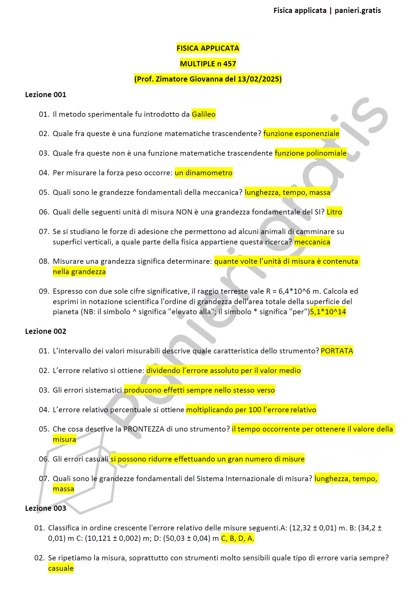 Paniere di Fisica applicata - MULTIPLE - in ordine di lezione per il CdS in SCIENZE BIOLOGICHE, Prof. Zimatore Giovanna del 13/02/2025Informazioni Aggiuntive