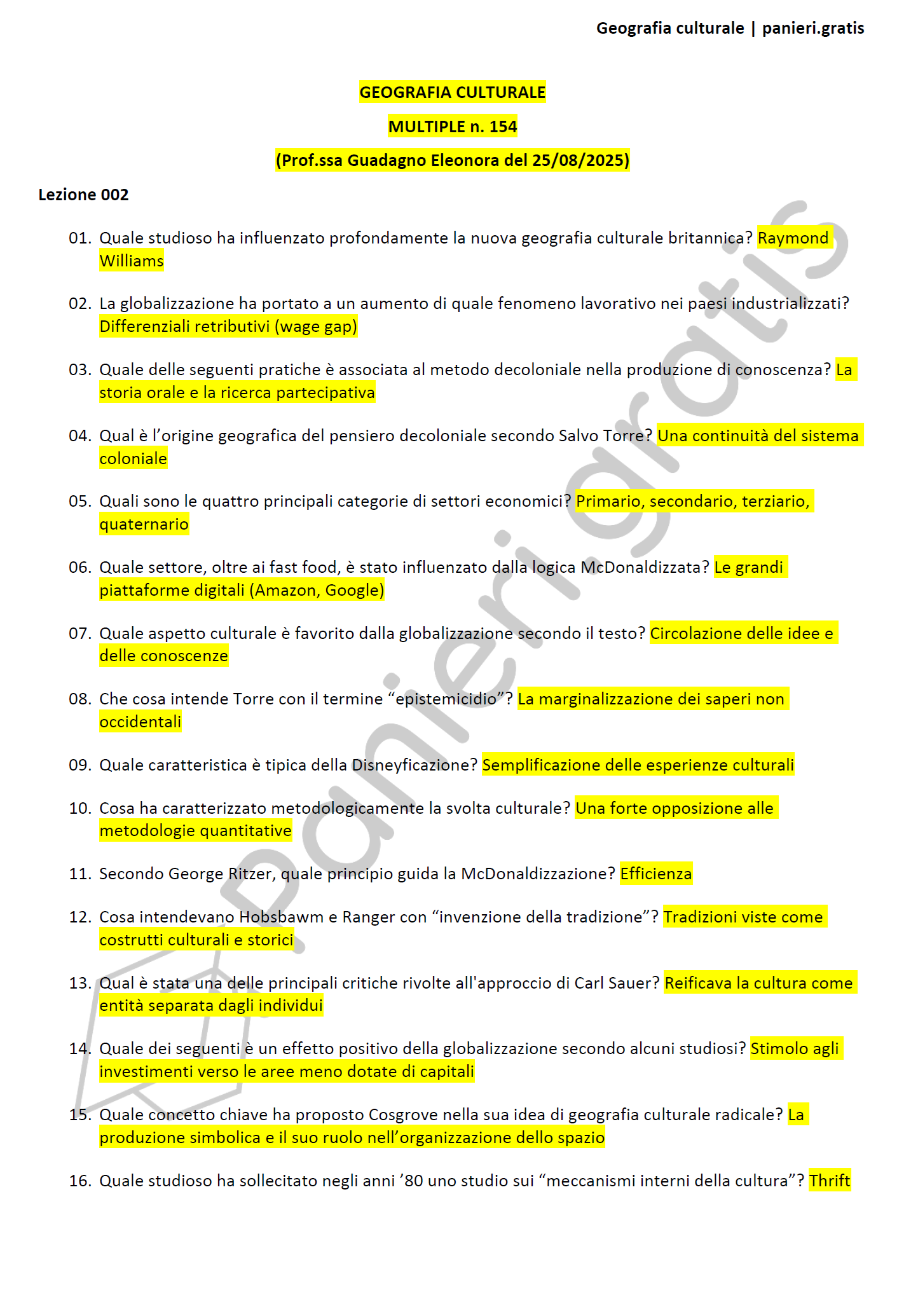 Paniere di Geografia culturale - Multiple - in ordine di lezione per il CdS in Letteratura, arte, musica e spettacolo LAMS, Prof.ssa Guadagno Eleonora del 25/08/2025Informazioni Aggiuntive
