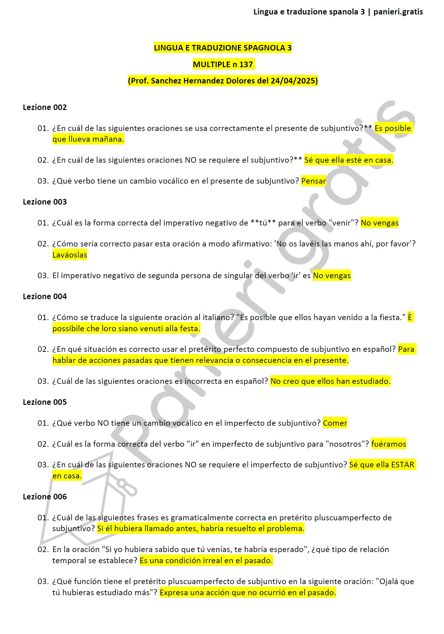 Paniere di Lingua e traduzione spagnola 3 - MULTIPLE - in ordine di lezione per la facoltà di LINGUE E LETTERATURE STRANIERE, Prof.ssa Sanchez Hernandez Dolores del 24/04/2025Informazioni Aggiuntive