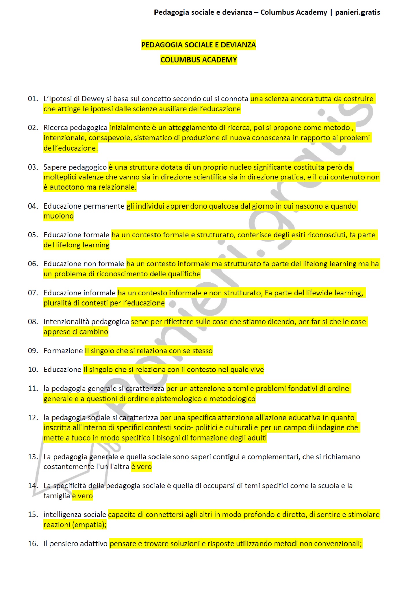 Paniere di Pedagogia sociale e devianza completo di tutte le 120 domande per le facoltà della Columbus AcademyDescrizione