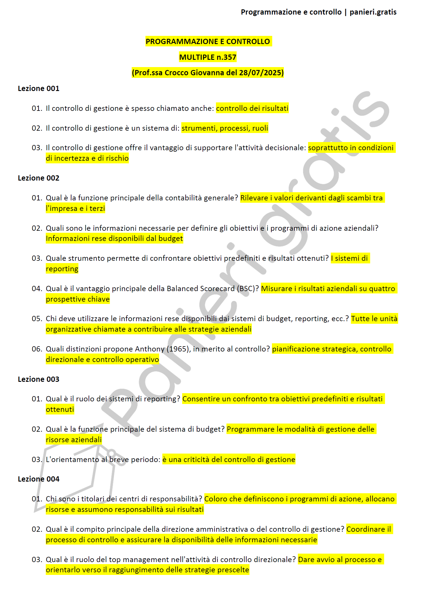 Paniere di Programmazione e controllo - MULTIPLE - in ordine di lezione per il CdS in Economia, Prof.ssa Crocco Giovanna del 28/07/2025 - eCampusInformazioni Aggiuntive