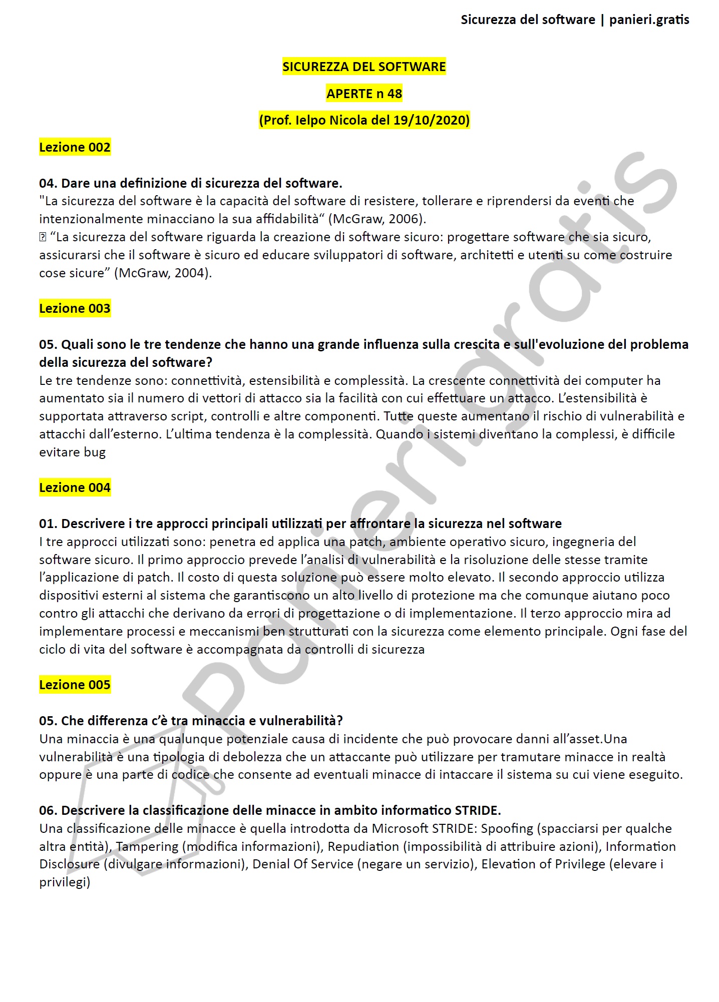 Paniere di Sicurezza del software - APERTE - in ordine di lezione per il CdS in Ingegneria informatica e dell'automazione, Prof. Ielpo Nicola del 19/10/2020Informazioni Aggiuntive