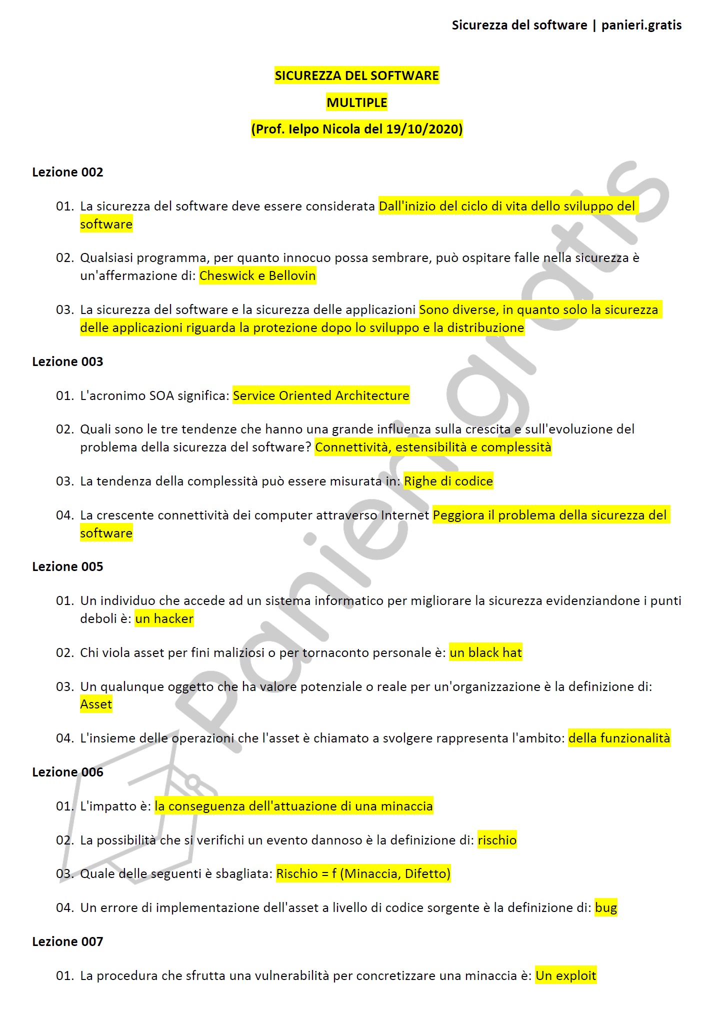 Paniere di Sicurezza del software - MULTIPLE - in ordine di lezione per il CdS in Ingegneria informatica e dell'automazione, Prof. Ielpo Nicola del 19/10/2020Informazioni Aggiuntive