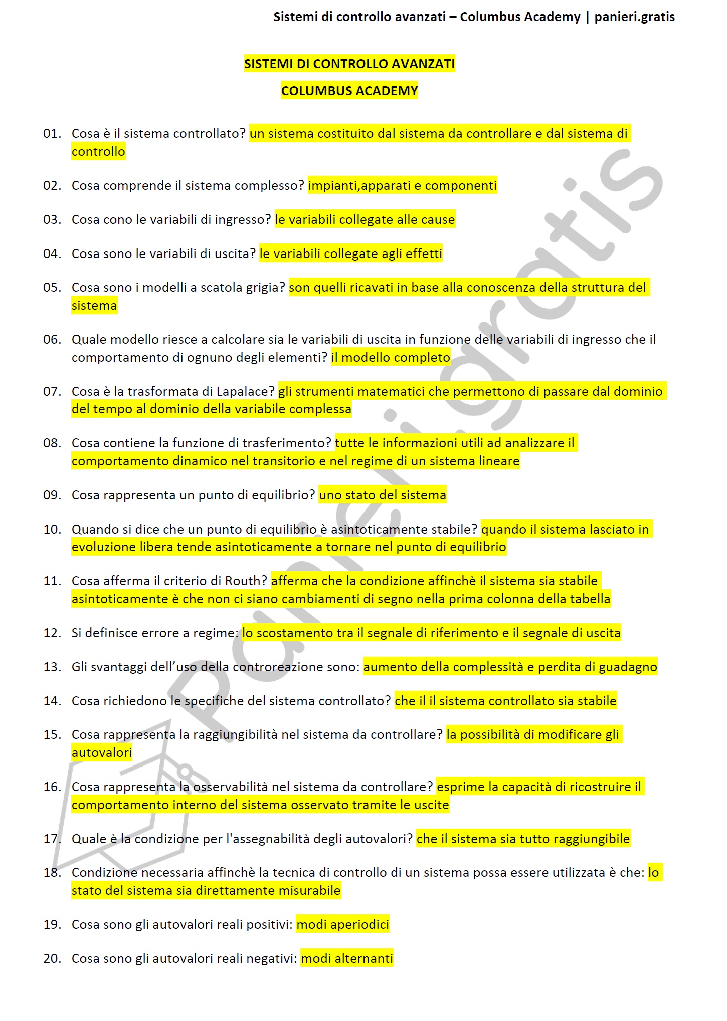 Paniere di Sistemi di controllo avanzati completo di tutte le 180 domande per le facoltà della Columbus AcademyInformazioni Aggiuntive