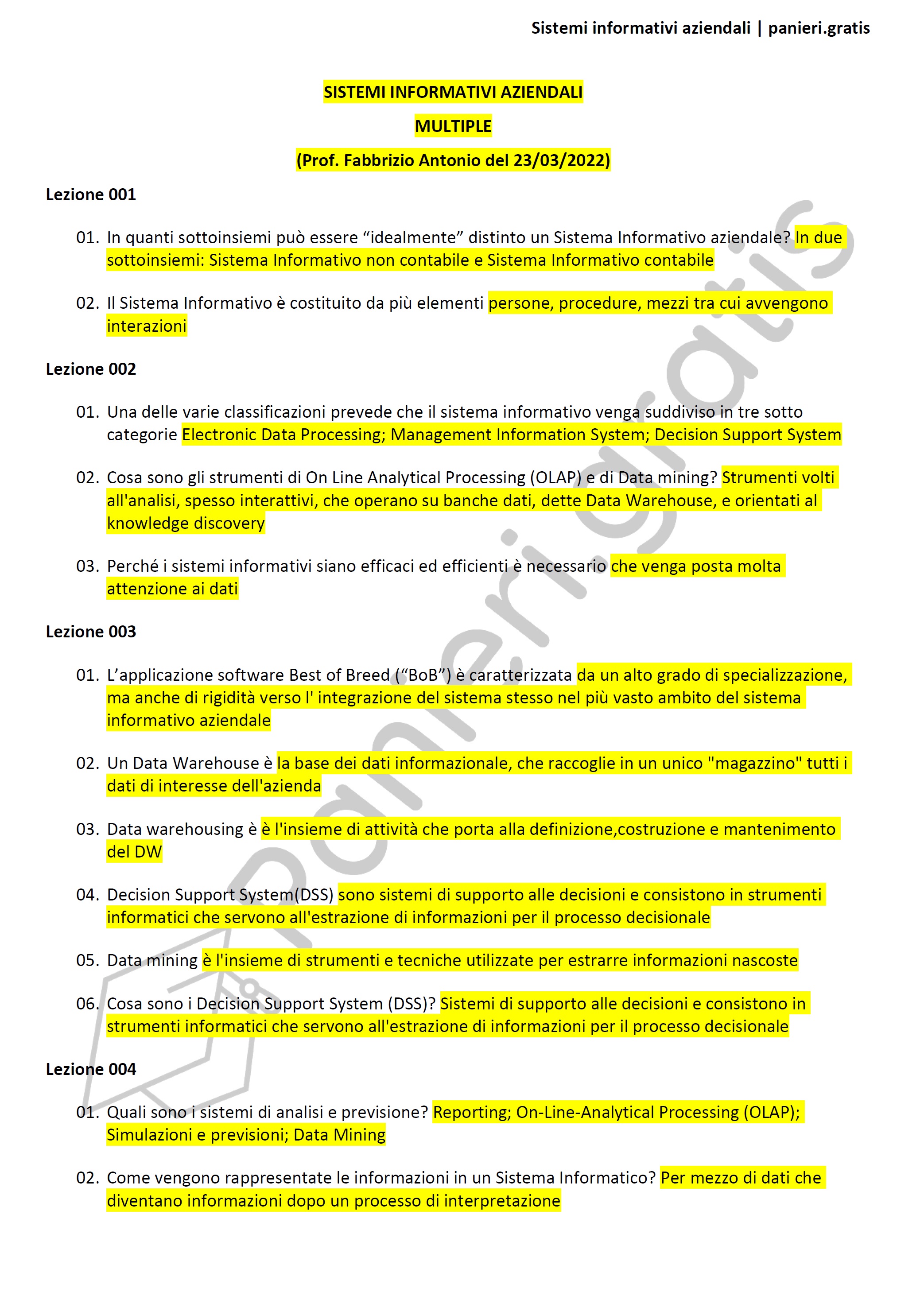 Paniere di Sistemi informativi aziendali - MULTIPLE - per il CdS in Ingegneria informatica e dell'automazione, del Prof. Fabbrizio Antonio del 23/03/2022 - eCampusInformazioni Aggiuntive