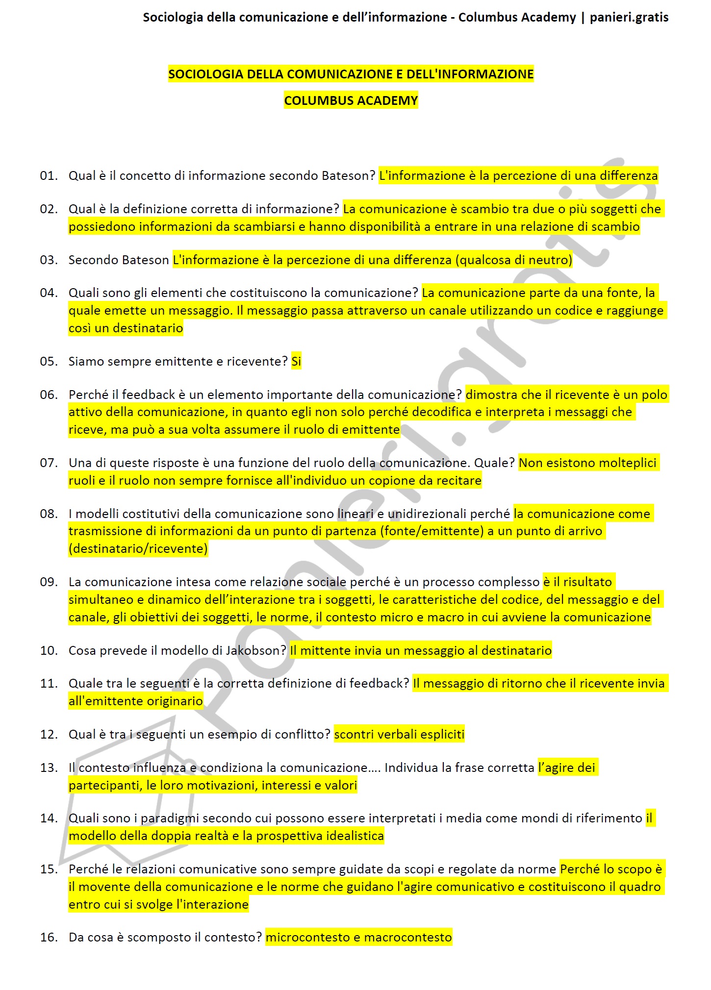 Paniere di Sociologia della comunicazione e dell’informazione completo di tutte le domande per le facoltà della Columbus AcademyInformazioni Aggiuntive