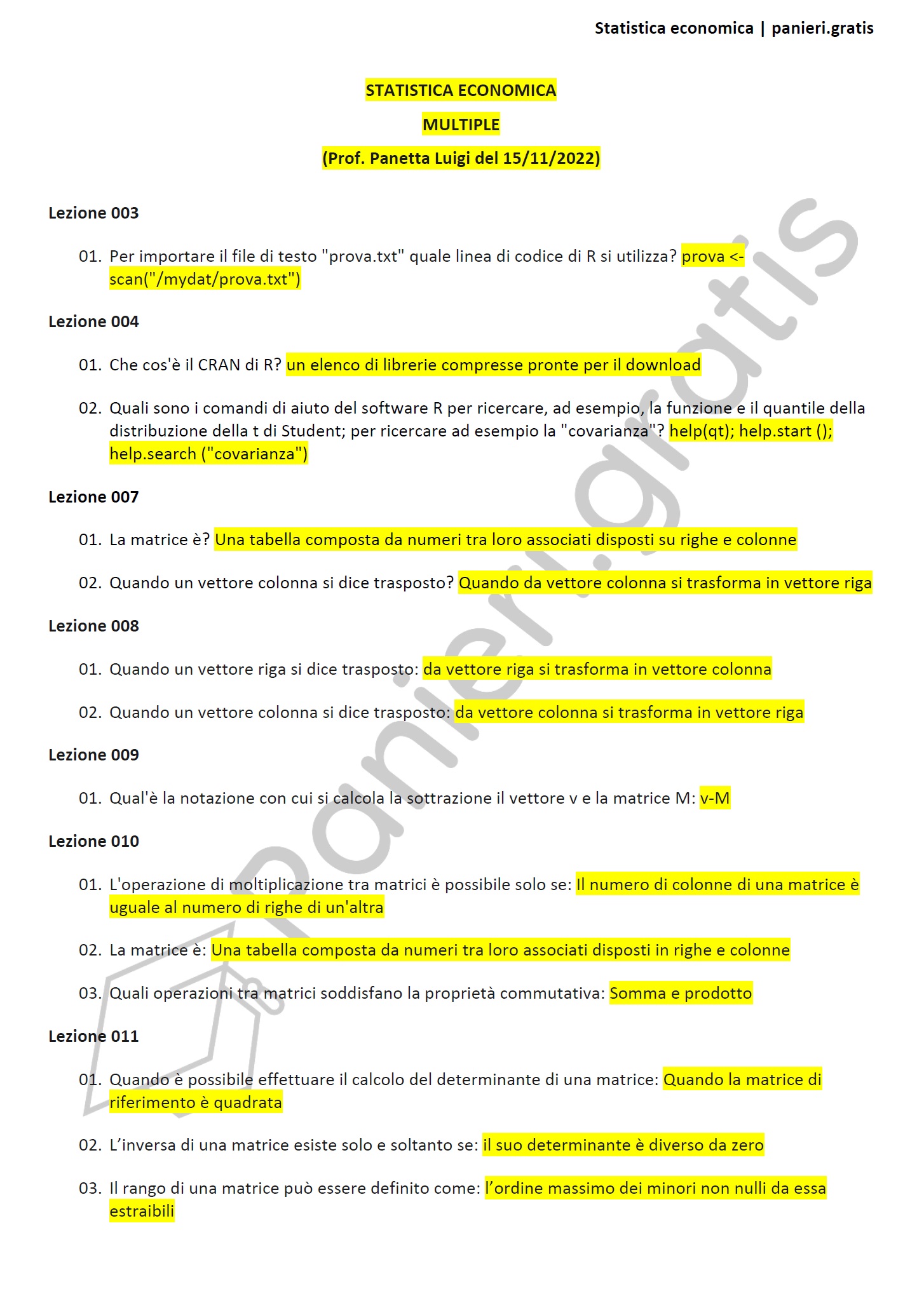 Paniere di Statistica economica - Multiple - Prof. Panetta - A46 - eCampus