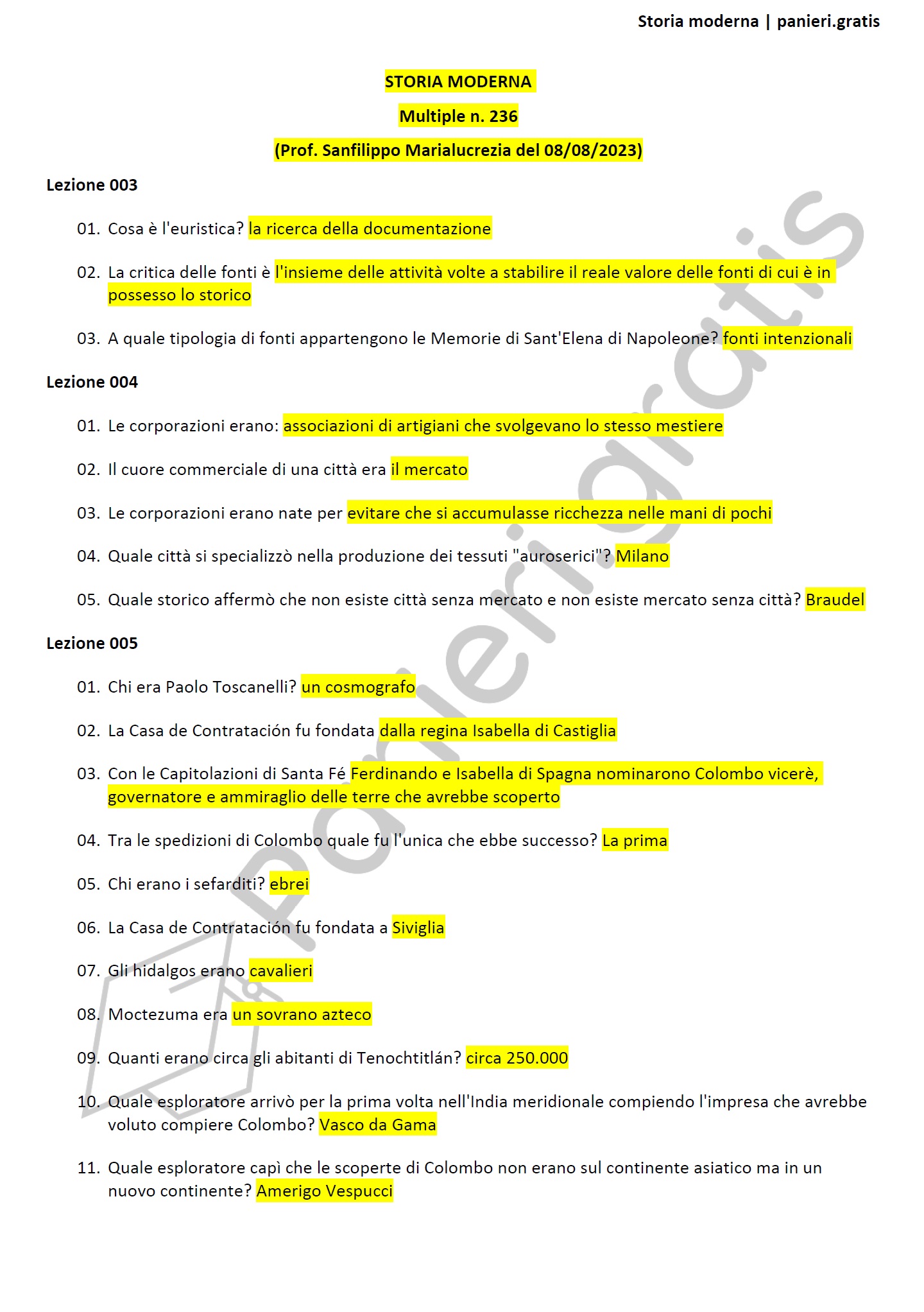 Paniere di Storia moderna - MULTIPLE - in ordine di lezione per il CdS in Scienze pedagogiche, Prof. Sanfilippo Marialucrezia del 08/08/2023Informazioni Aggiuntive