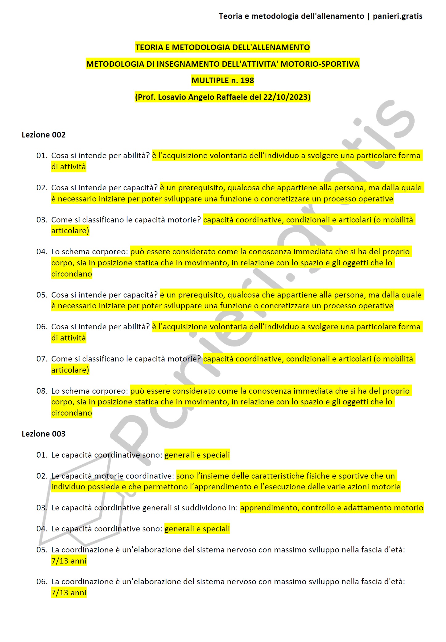 Paniere di Teoria e metodologia dell’allenamento - in ordine di lezione per il Master in Metodologia di insegnamento dell'attività motorio-sportiva, Prof. Losavio Angelo Raffaele del 22/10/2023Descrizione