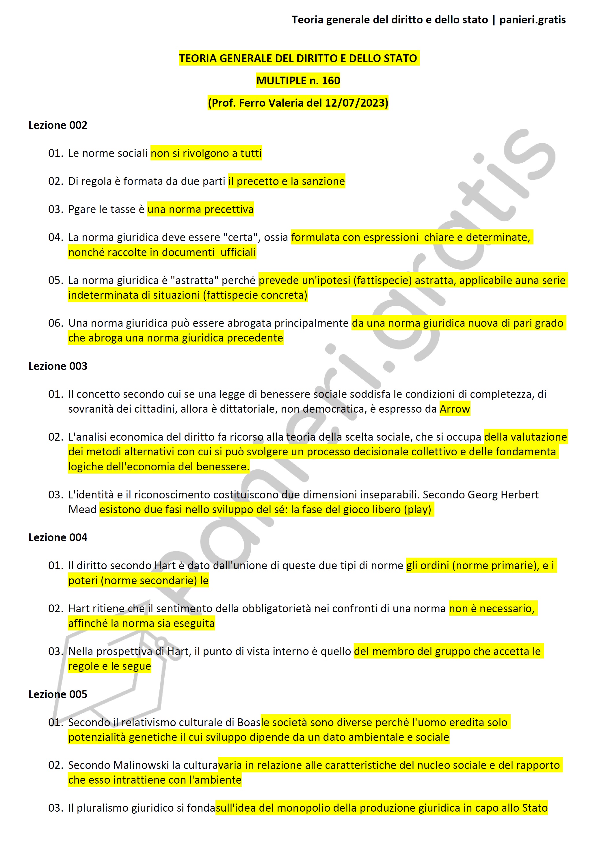 Paniere di Teoria generale del diritto e dello stato - MULTIPLE - in ordine di lezione per il CdS in SCIENZE POLITICHE E SOCIALI, Prof. Ferro Valeria del 12/07/2023Informazioni Aggiuntive