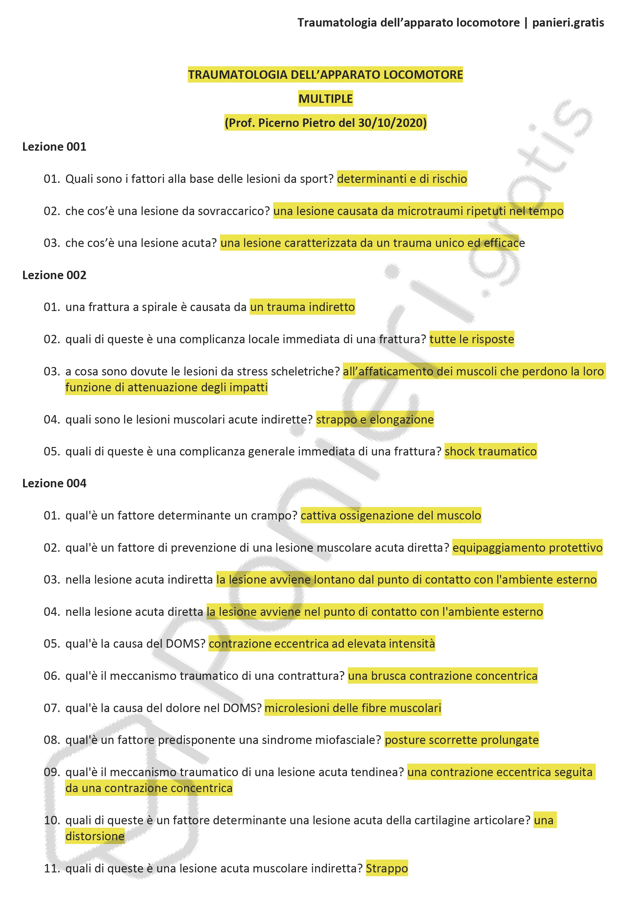 Paniere di Traumatologia dell’apparato locomotore - MULTIPLE - in ordine di LEZIONE e ALFABETICO per la facoltà di SCIENZE DELLE ATTIVITA' MOTORIE E SPORTIVE, Prof. Picerno Pietro del 30/10/2020Informazioni Aggiuntive