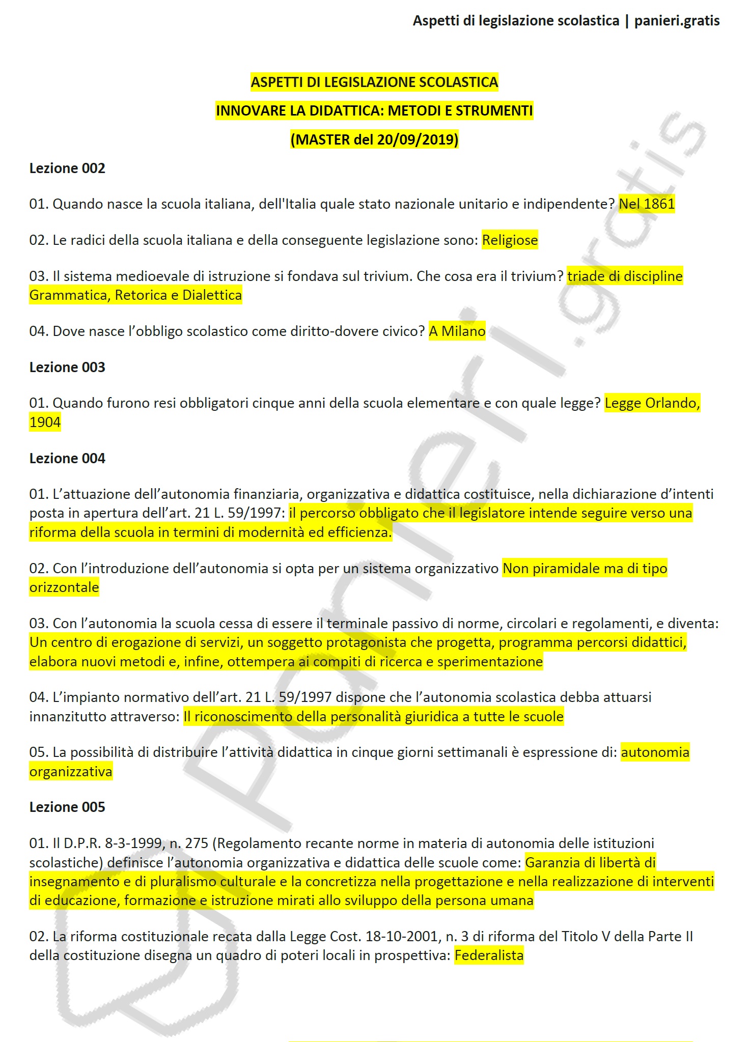 Paniere di Aspetti di legislazione scolastica, in ordine di lezione per il Master Innovare la didattica: metodi e strumenti, del 20/09/2019Informazioni Aggiuntive