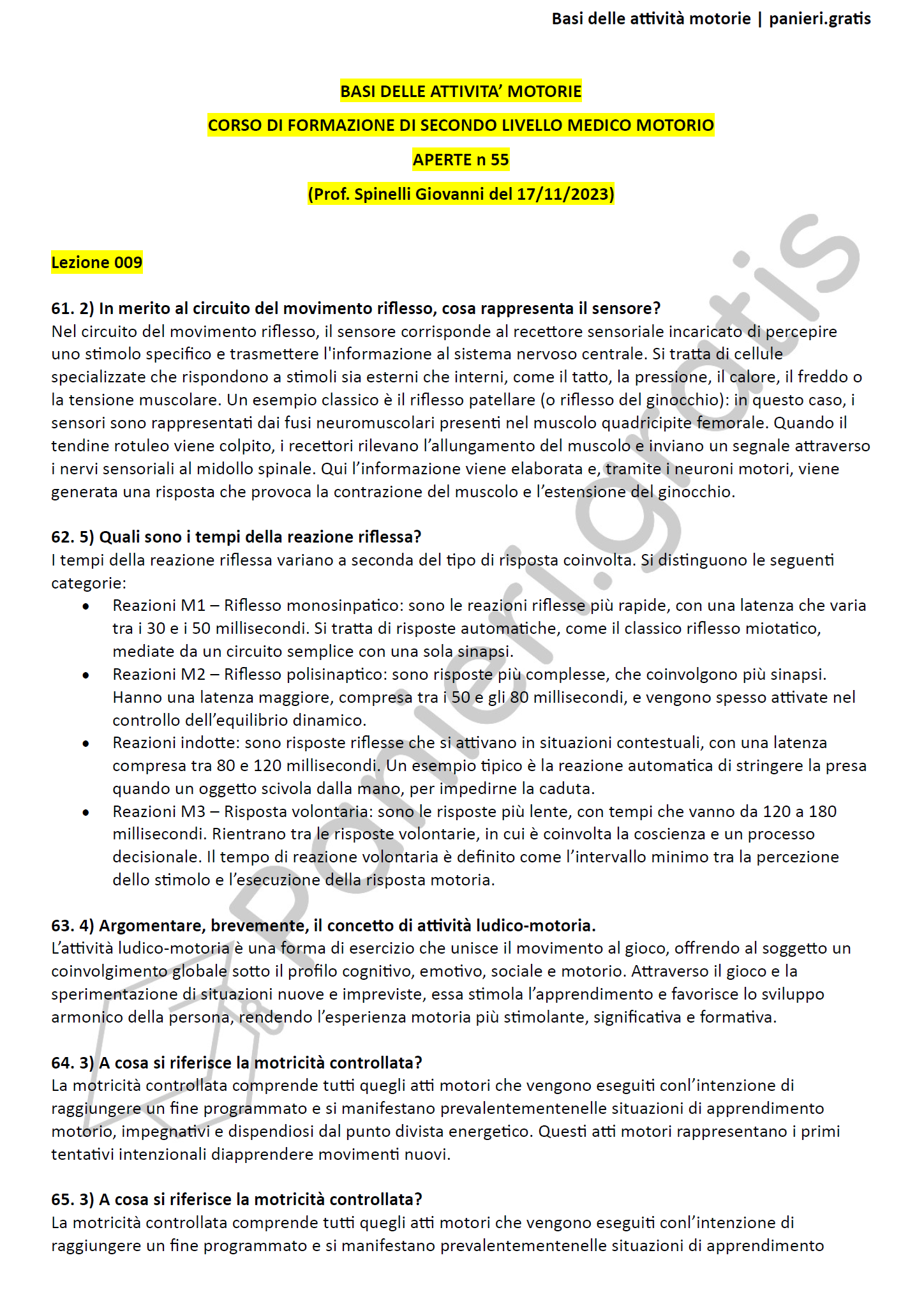 Paniere di Basi delle attività motorie - APERTE - in ordine di lezione per il Corso di formazione di secondo livello medico-motorio, Prof. Spinelli Giovanni del 17/11/2023, eCampusInformazioni Aggiuntive