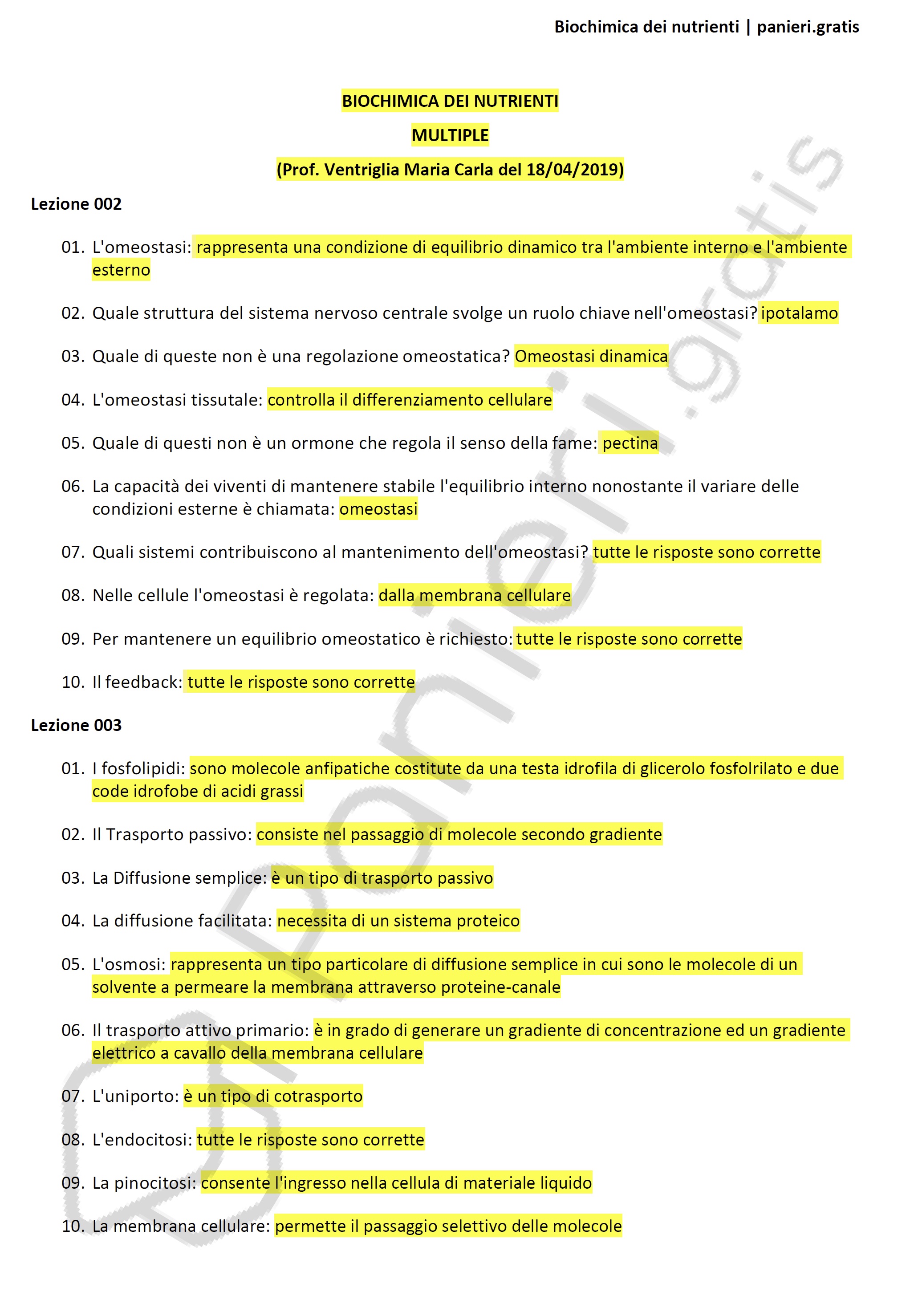 Paniere di Biochimica dei nutrienti - MULTIPLE - in ordine di lezione per il CdS in Scienze biologiche, Prof. Ventriglia Maria Carla del 18/04/2019Informazioni Aggiuntive