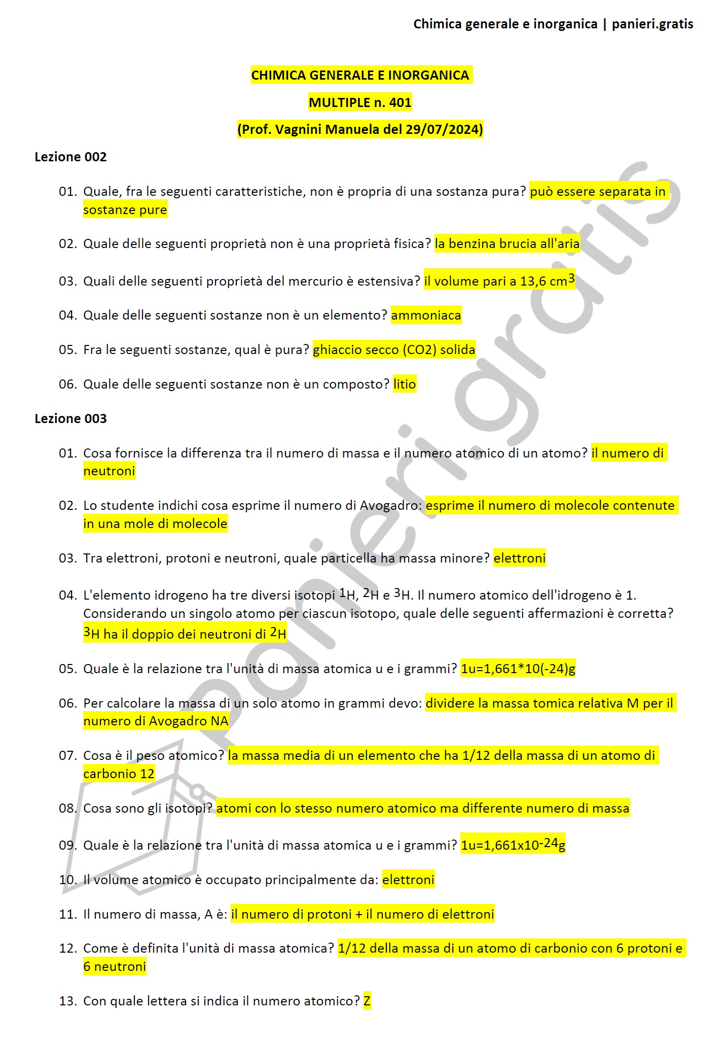 Paniere di chimica generale e inorganica - MULTIPLE - in ordine di lezione per il CdS in Scienze biologiche, Prof. Vagnini Manuela del 29/07/2024Informazioni Aggiuntive