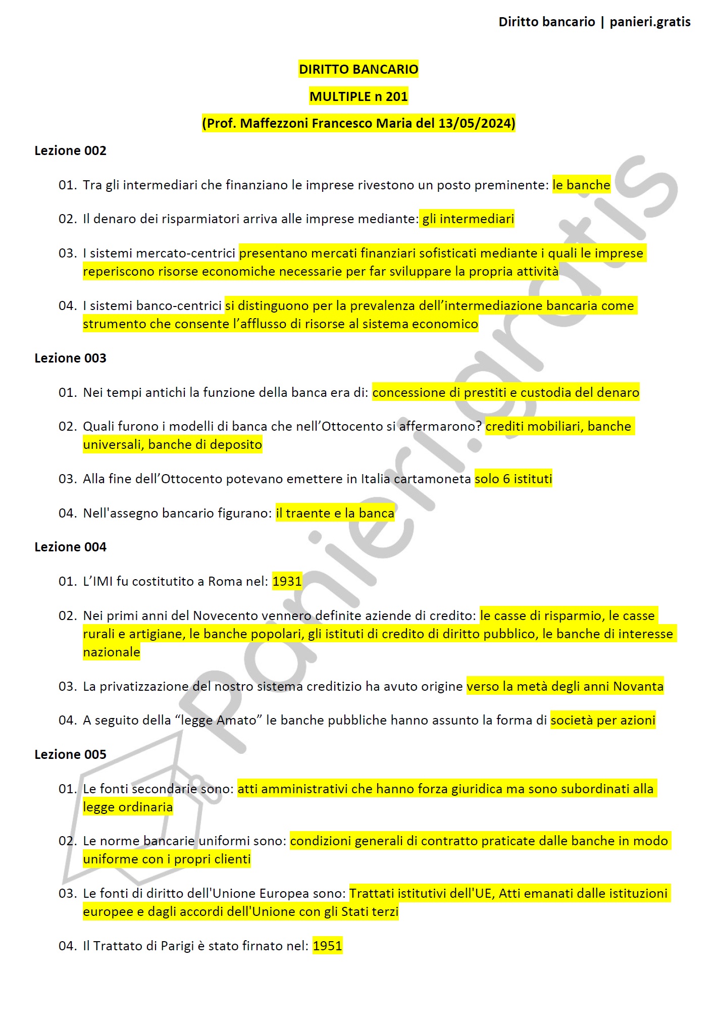 Paniere di Diritto bancario - MULTIPLE - in ordine di lezione per il CdS in ECONOMIA, del Prof. Maffezzoni Francesco Maria del 13/05/2024Informazioni Aggiuntive