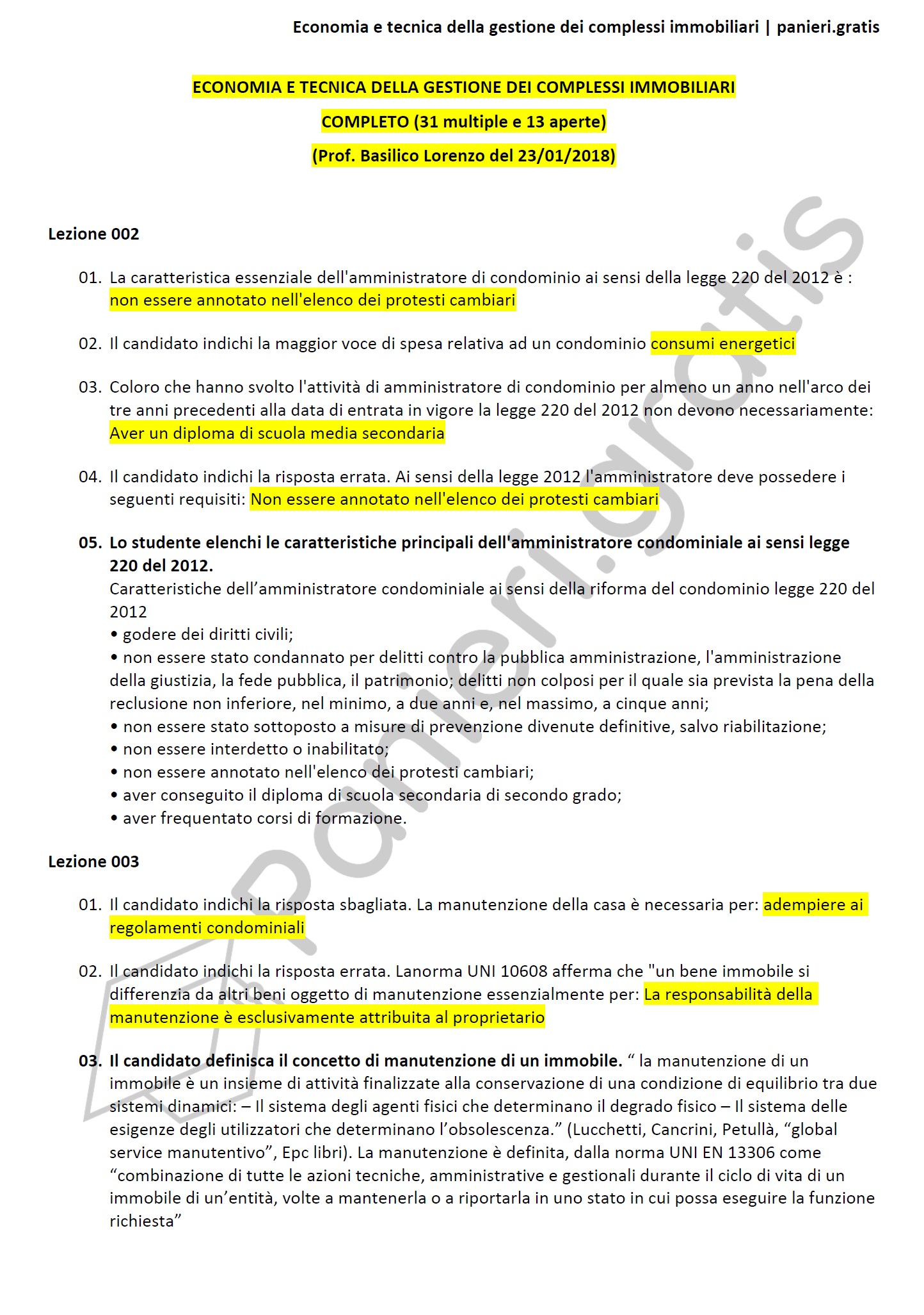 Paniere di Economia e tecnica della gestione dei complessi immobiliari - COMPLETO (Multiple e Aperte) - in ordine di lezione per il CdS in Economia, Prof. Basilico Lorenzo del 23/01/2018 - eCampusInformazioni Aggiuntive