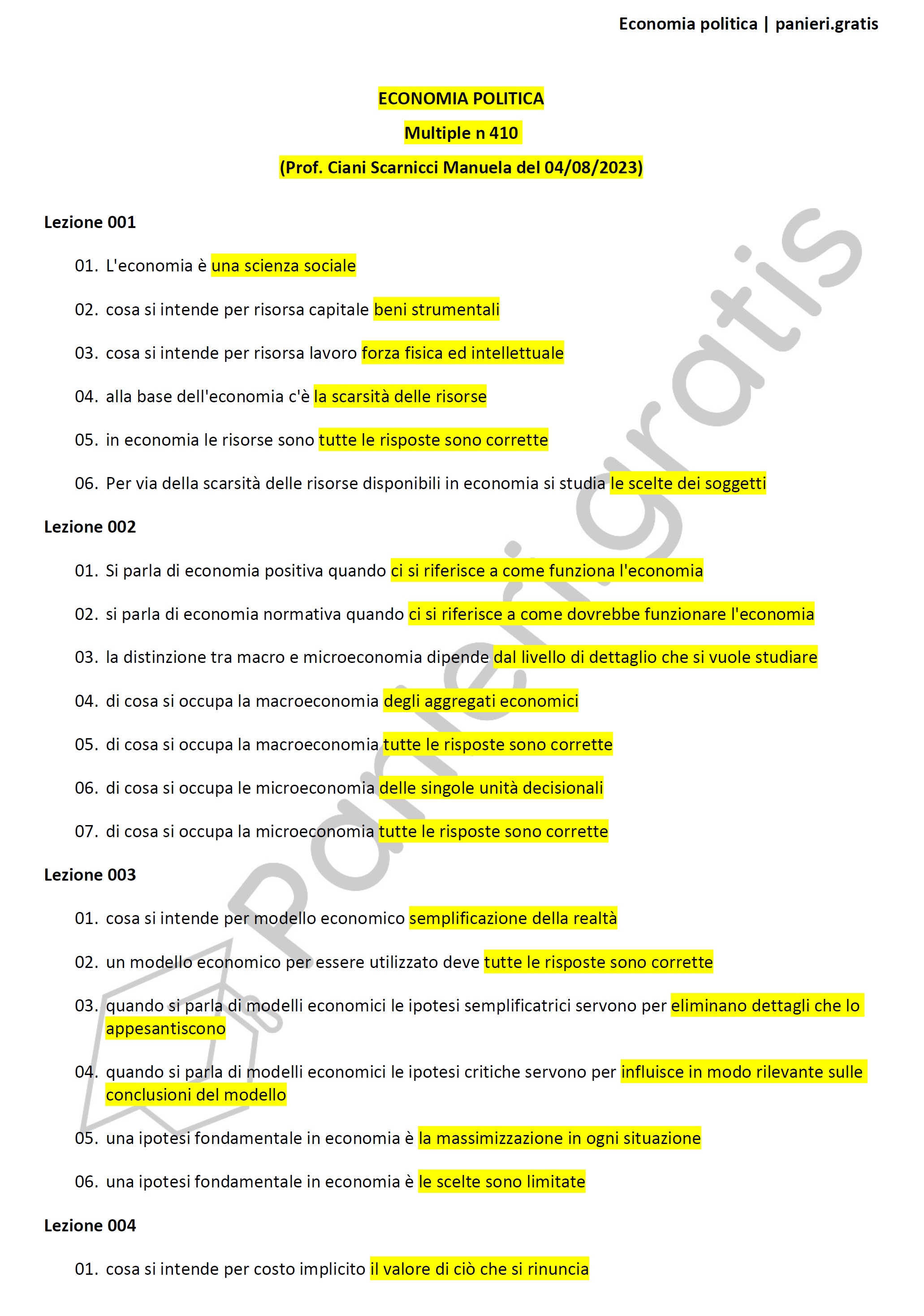 Paniere di Economia politica - MULTIPLE - in ordine di lezione per il CdS in Scienze politiche e sociali eCampus, Prof. Ciani Scarnicci Manuela del 04/08/2023Informazioni Aggiuntive
