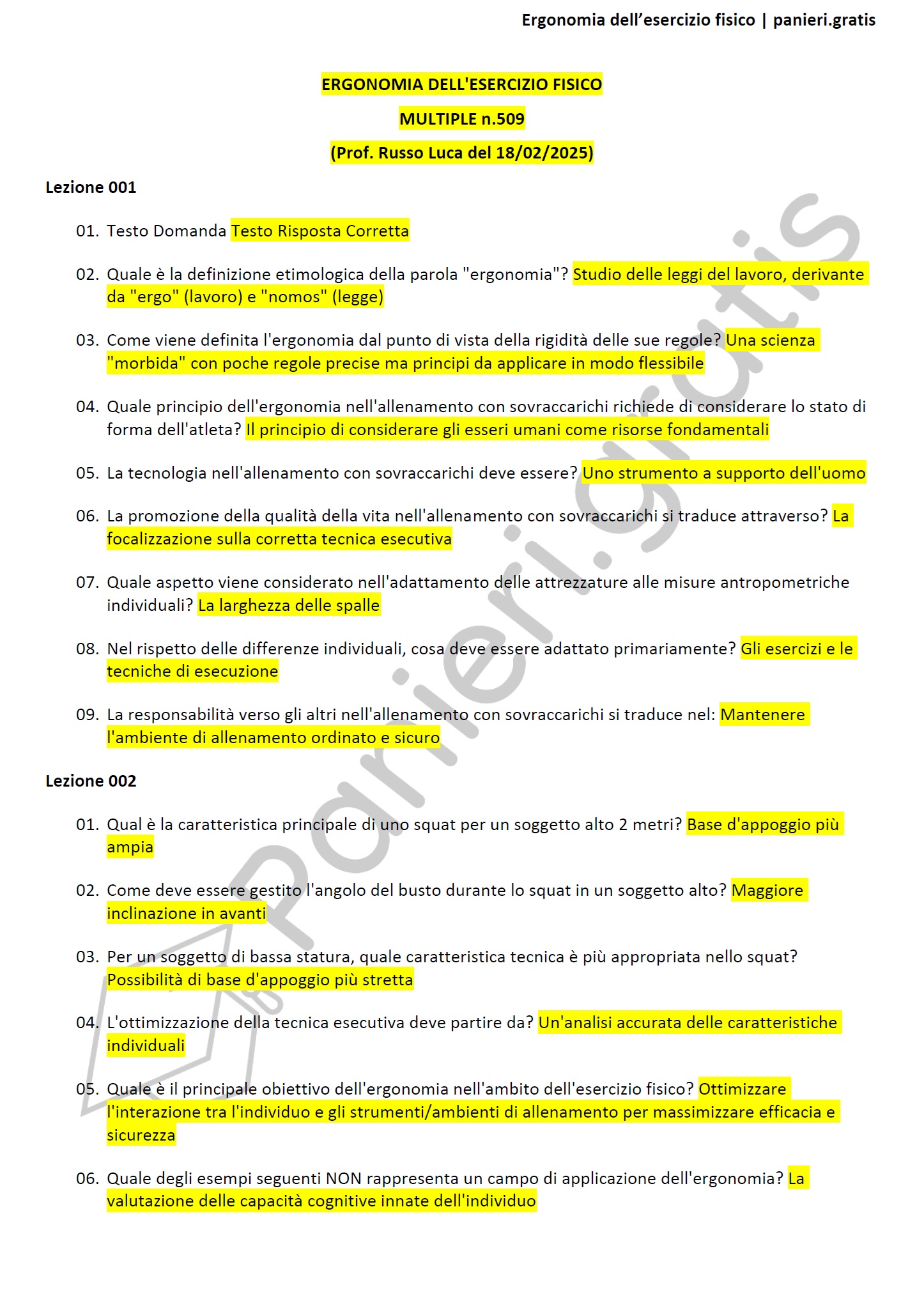Paniere di Ergonomia dell'esercizio fisico - MULTIPLE - in ordine di lezione per il CdS in Scienze dell'esercizio fisico per il benessere e la salute, Prof. Russo Luca del 18/02/2025Descrizione