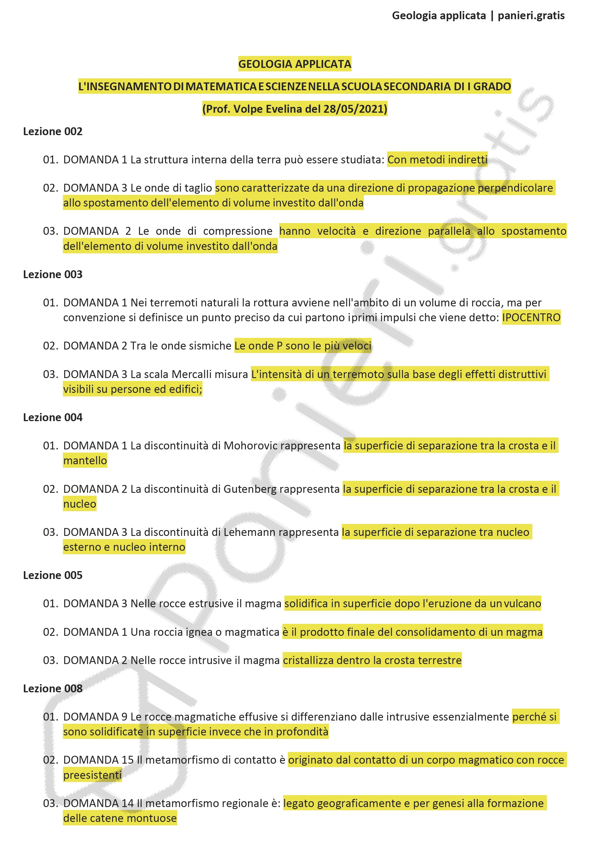 Paniere di Geologia applicata - in ordine di lezione per il Master A28, L'INSEGNAMENTO DI MATEMATICA E SCIENZE NELLA SCUOLA SECONDARIA DI I GRADO, Prof. Volpe Evelina del 28/05/2021