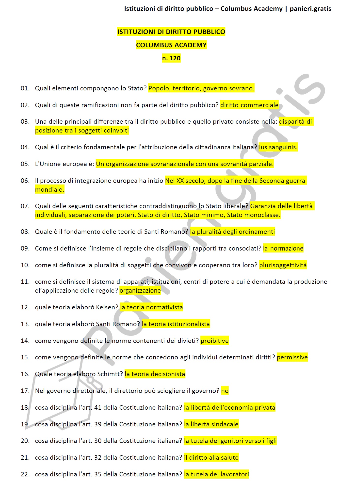 Paniere di Istituzioni di diritto pubblico completo di tutte le 120 domande per le facoltà della Columbus AcademyDescrizione