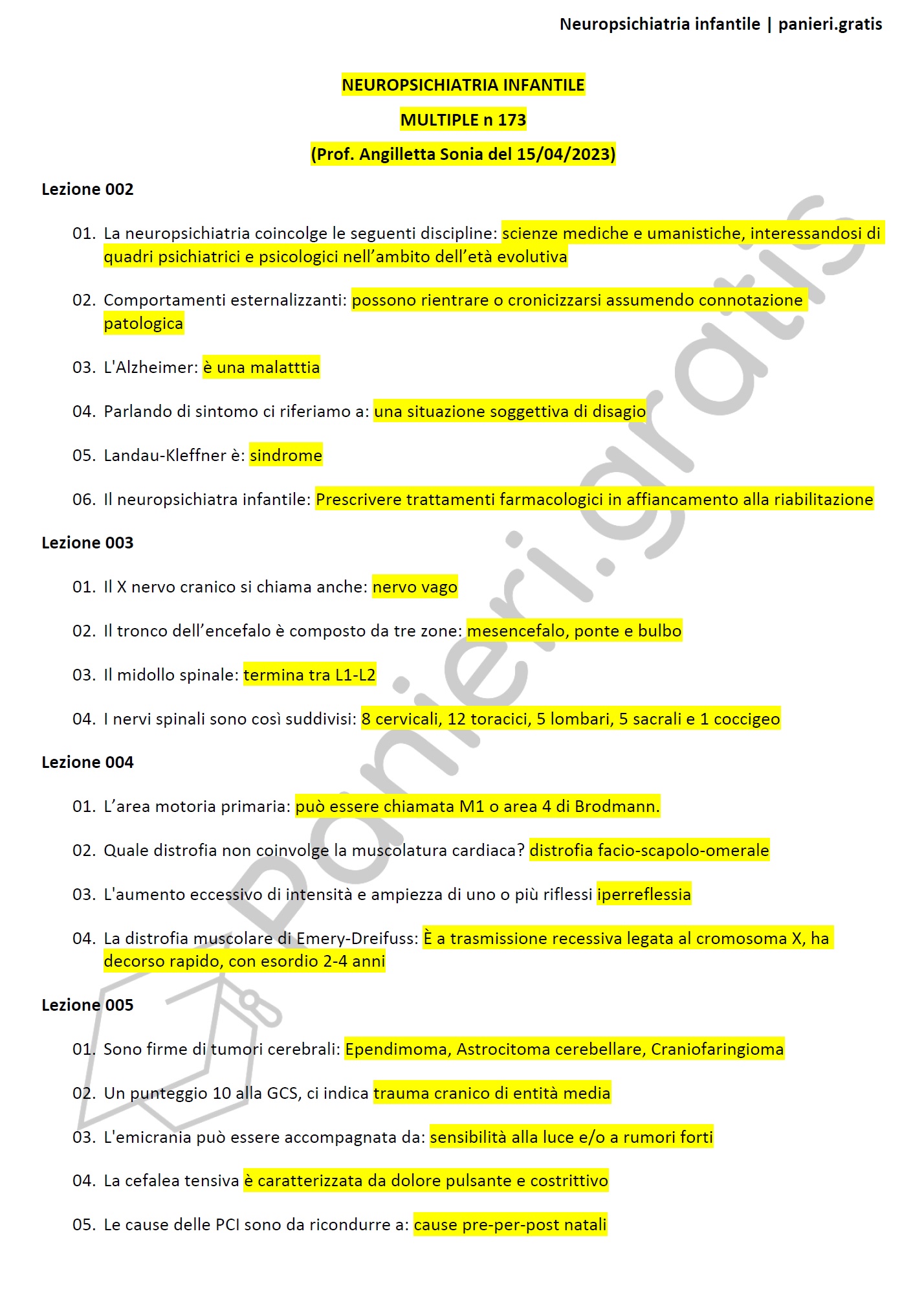 Paniere di Neuropsichiatria infantile - MULTIPLE - in ordine di lezione per il CdS in Scienze dell'educazione e della formazione, Prof. Angilletta Sonia del 15/04/2023 - eCampusInformazioni Aggiuntive