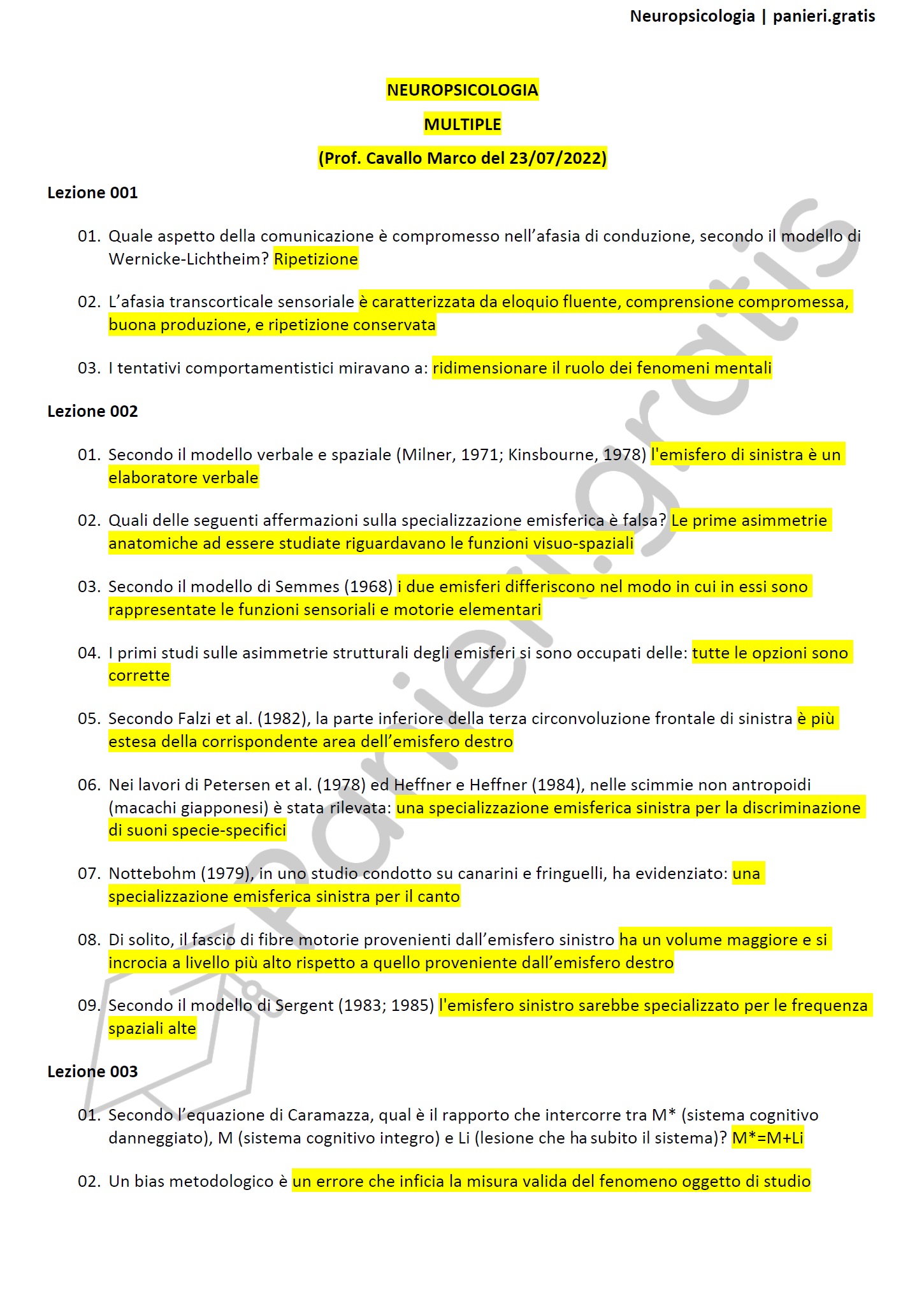 Paniere di Neuropsicologia - MULTIPLE - in ordine di lezione per il CdS in Scienze e tecniche psicologiche, Prof. Cavallo Marco del 23/07/2022Informazioni Aggiuntive