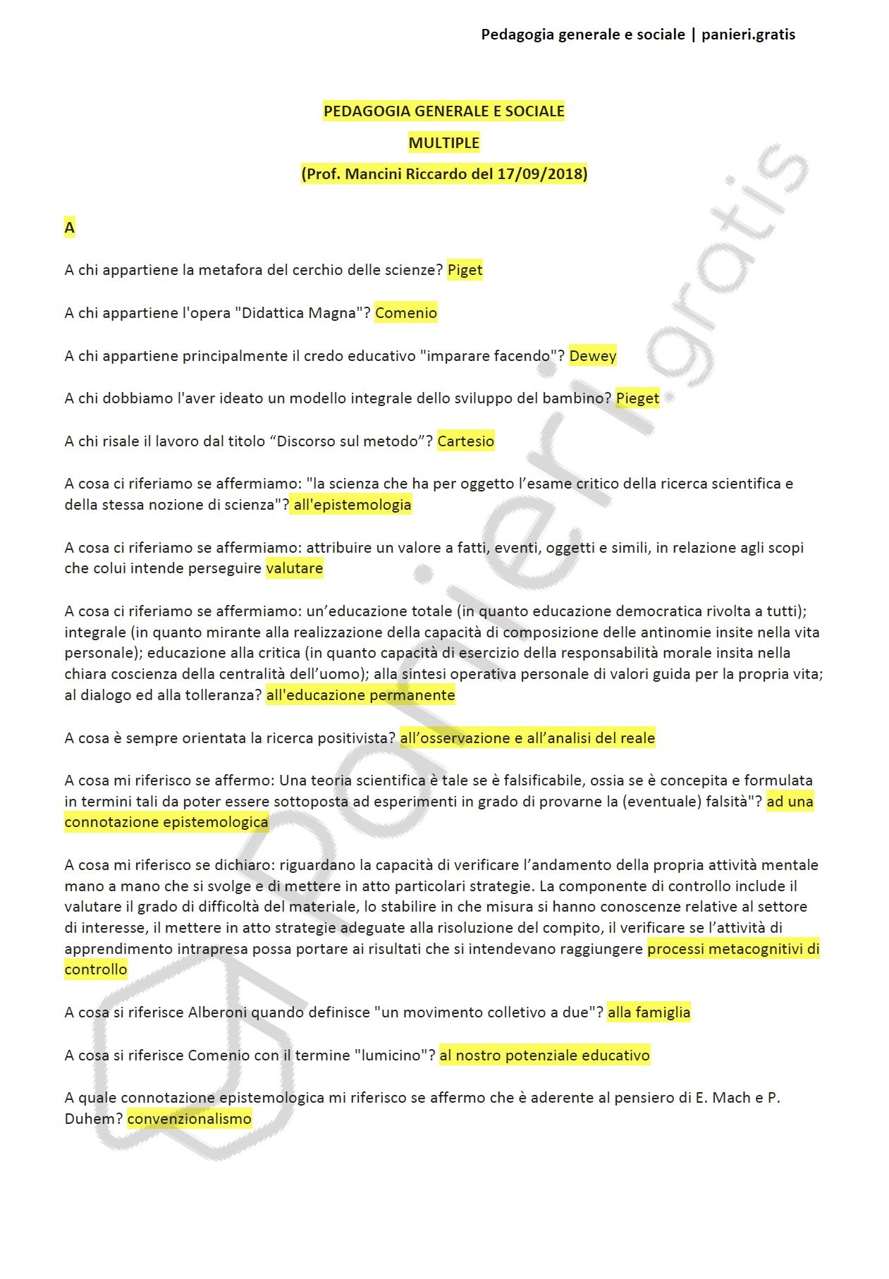 Paniere di pedagogia generale e sociale - MULTIPLE - in ordine alfabetico per il CORSO DI QUALIFICAZIONE IN "EDUCATORE PROFESSIONALE SOCIO-PEDAGOGICO"E, Prof. Mancini Riccardo del 17/09/2018Informazioni Aggiuntive
