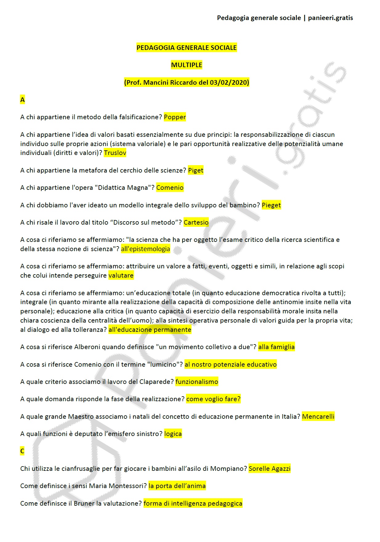 Paniere di Pedagogia generale sociale - MULTIPLE - in ordine alfabetico per 24 CFU (PERCORSO FORMATIVO DOCENTI (D.M. 616)), Prof. Mancini Riccardo del 03/02/2020Informazioni Aggiuntive