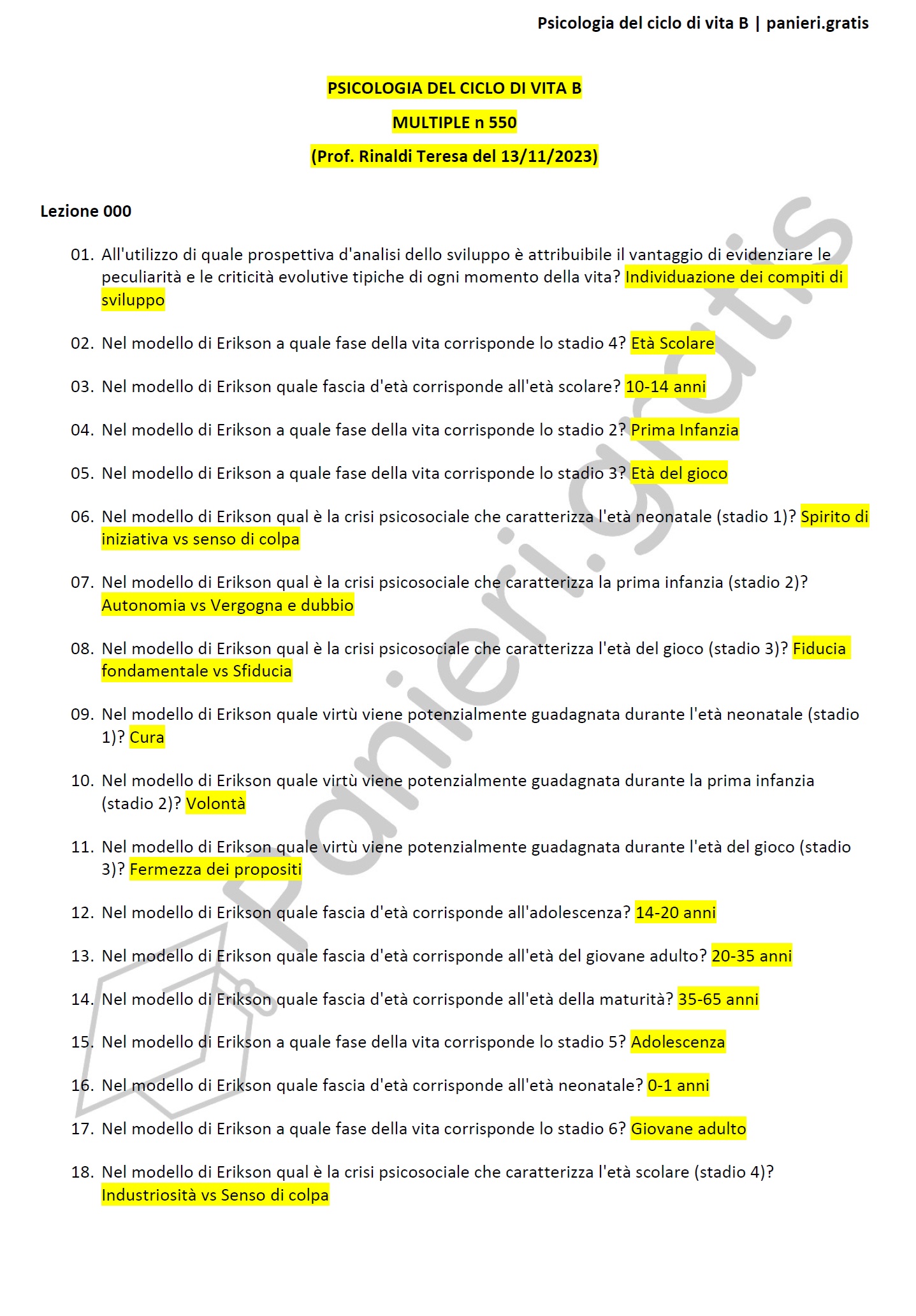 Paniere di Psicologia del ciclo di vita B - Multiple - in ordine di lezione per il CdS in Psicologia, del Prof. Rinaldi Teresa del 13/11/2023 - eCampusInformazioni Aggiuntive