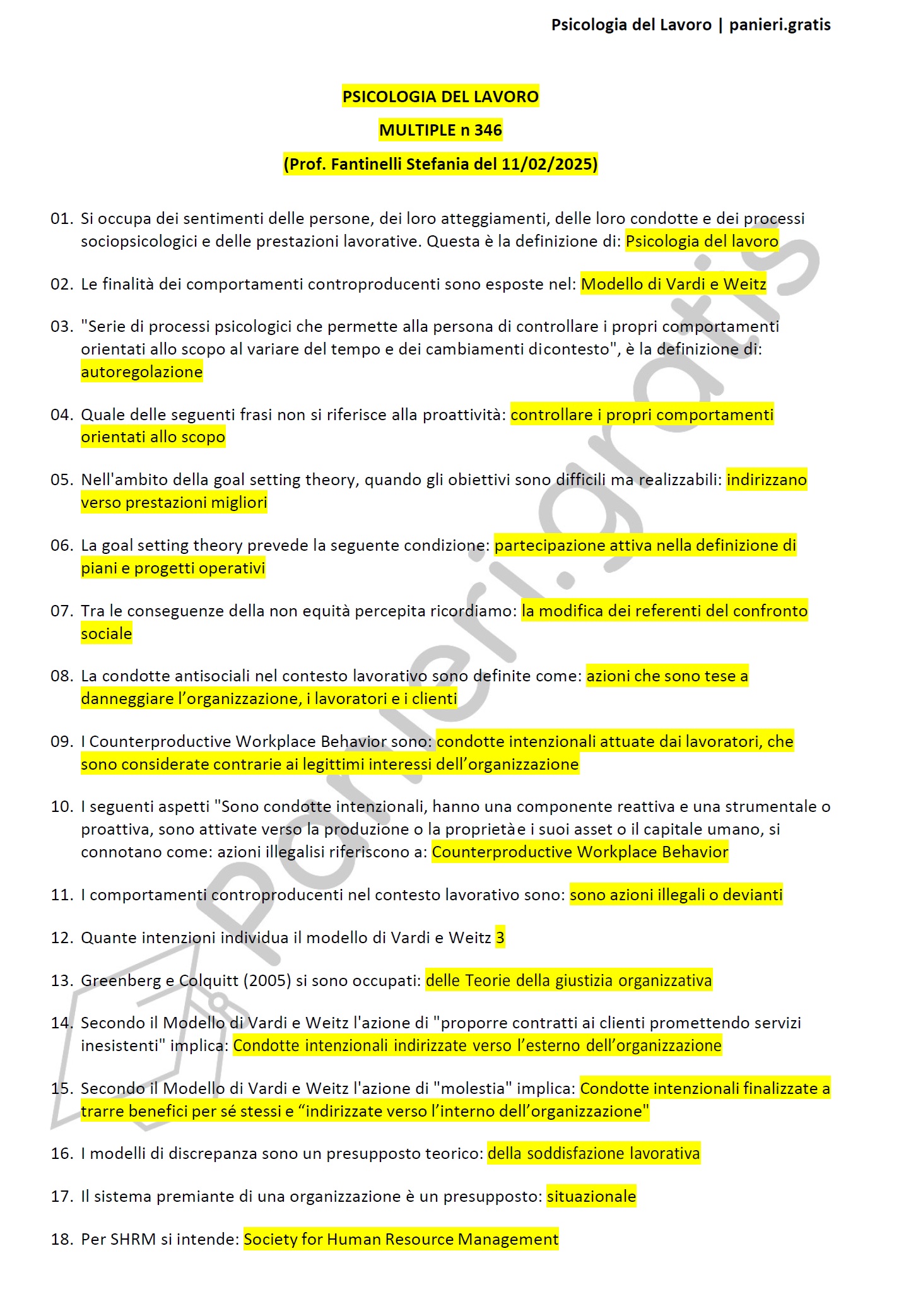 Paniere di Psicologia del lavoro - MULTIPLE - in ordine di lezione per il CdS in Scienze e tecniche psicologiche, Prof. Fantinelli Stefania del 11/02/2025 - eCampusInformazioni Aggiuntive