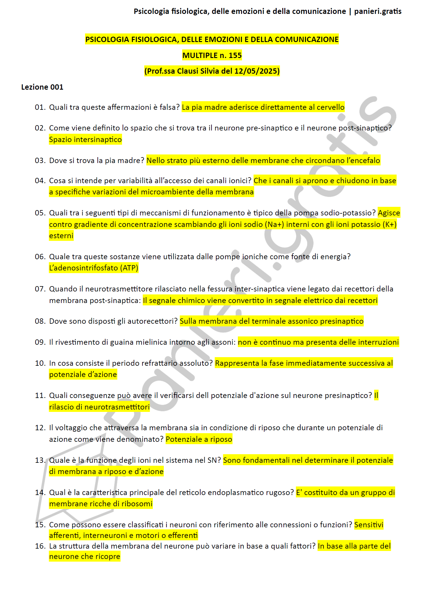 Paniere di Psicologia fisiologica, delle emozioni e della comunicazione - MULTIPLE - in ordine di lezione per il CdS in Scienze delle attività motorie e sportive, Prof.ssa Clausi Silvia del 12/05/2025 - eCampusDescrizione