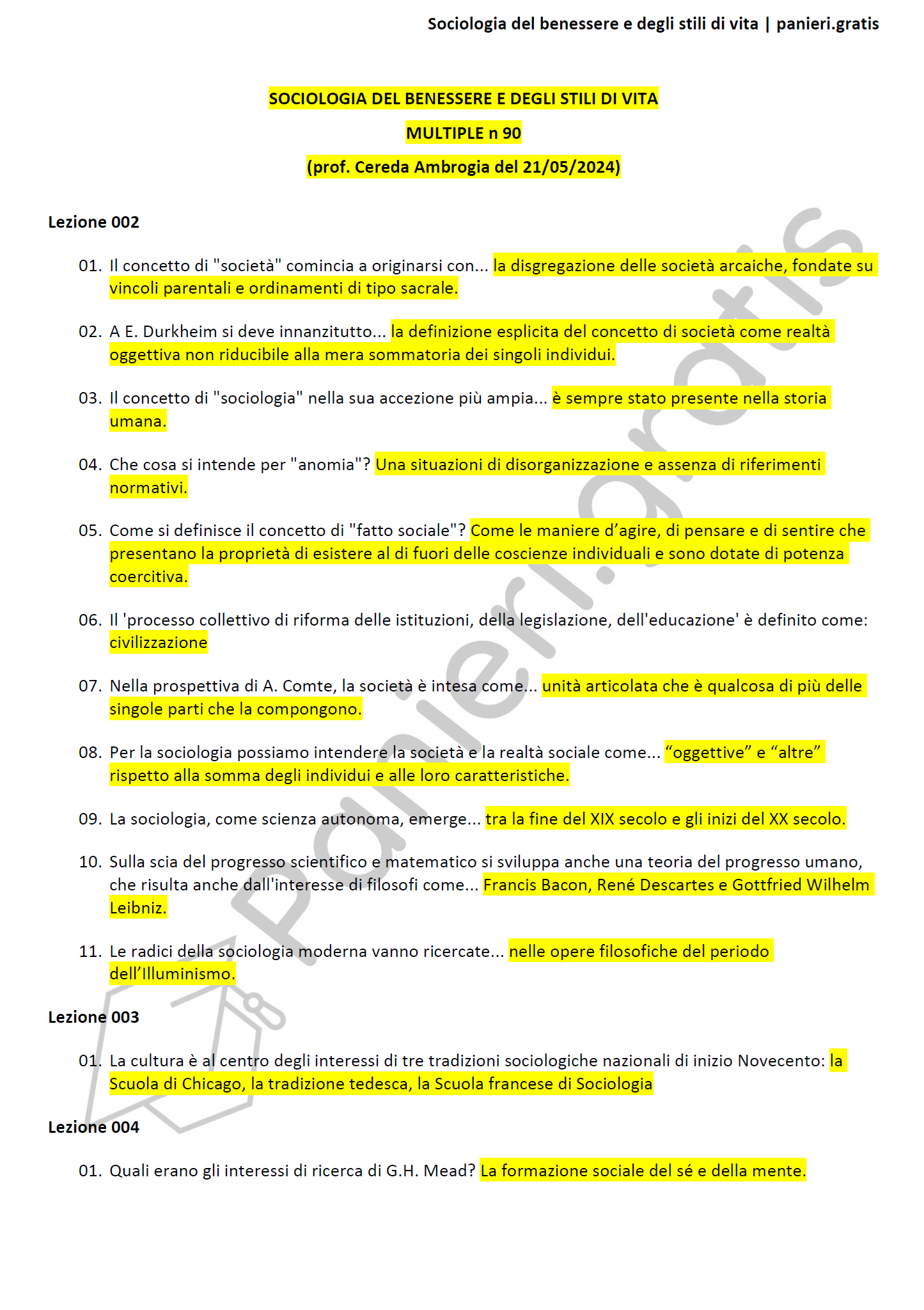 Paniere di Sociologia del benessere e degli stili di vita - MULTIPLE - in ordine di lezione per il CdS in Scienze della nutrizione, Prof. Cereda Ambrogia del 21/05/2024 - eCampusInformazioni Aggiuntive