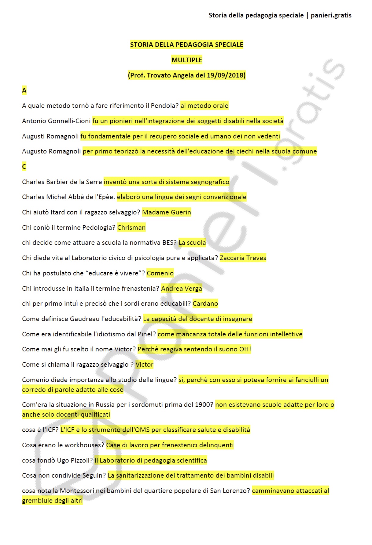 Paniere di Storia della pedagogia speciale - MULTIPLE - in ordine alfabetico per il CORSO DI QUALIFICAZIONE IN "EDUCATORE PROFESSIONALE SOCIO-PEDAGOGICO", Prof. Trovato Angela del 19/09/2018Informazioni Aggiuntive