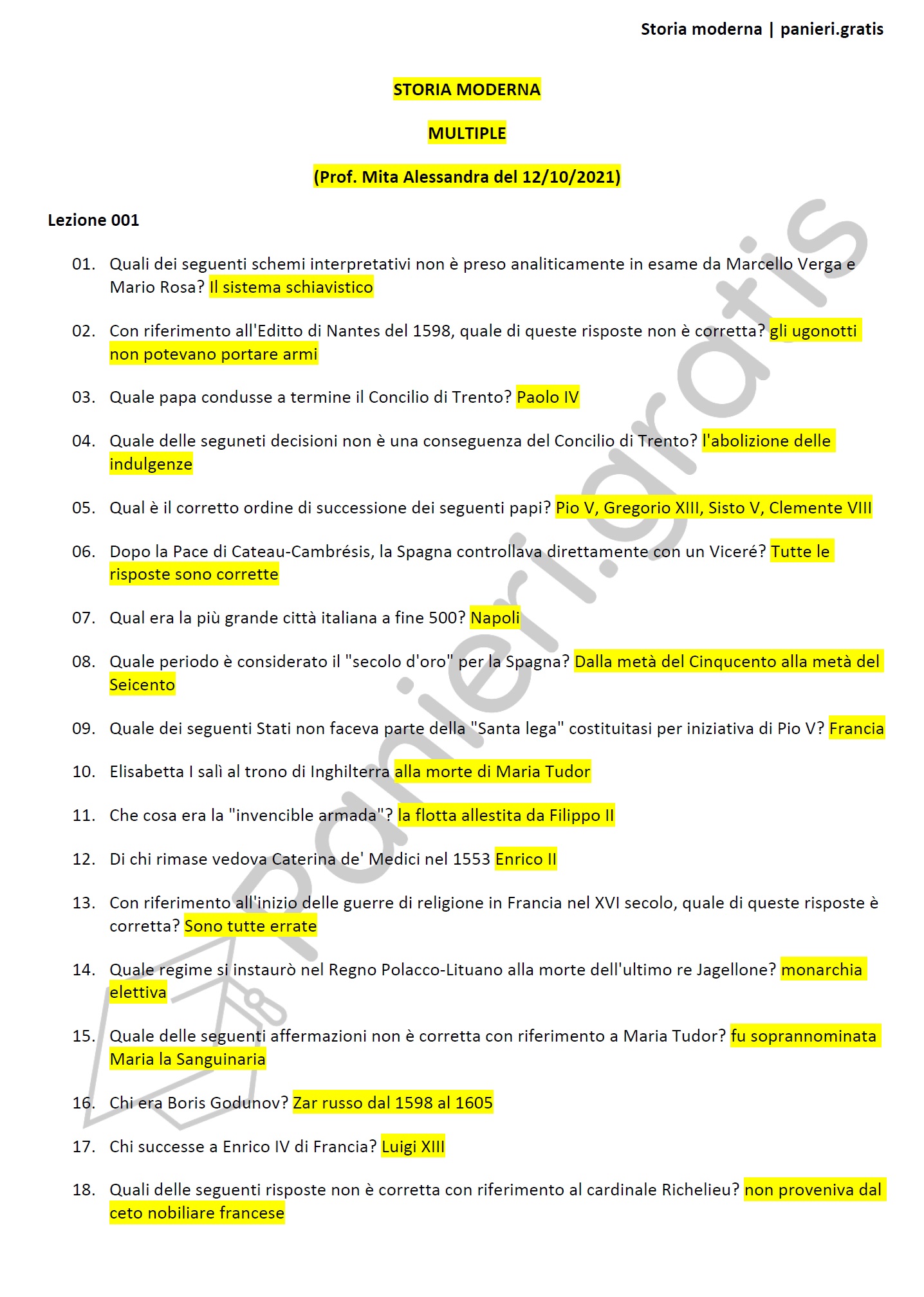 Paniere di Storia moderna - MULTIPLE (+ FUORI PANIERE) - in ordine di lezione per il CdS in Scienze del turismo, Prof. Mita Alessandra del 12/10/2021Informazioni Aggiuntive