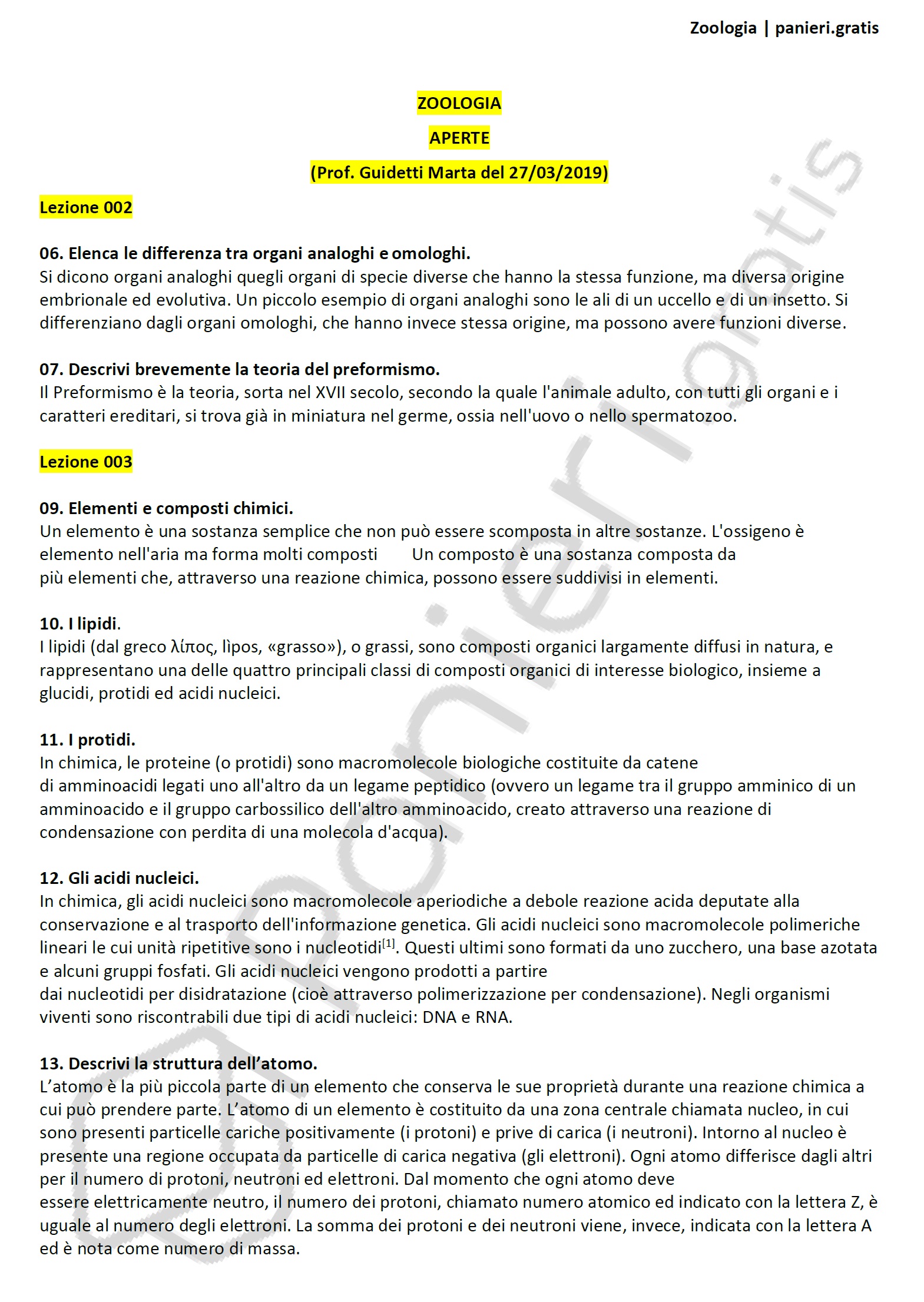 Paniere di Zoologia - APERTE - in ordine di lezione per il CdS in Scienze biologiche, Prof. Guidetti Marta del 27/03/2019Informazioni Aggiuntive